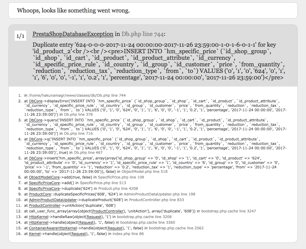 dePereira Posted March 21, 2018 Share Posted March 21, 2018 Buenos días familia, He actualizado la tienda hace un par de semanas de la 1.6 a la 1.7. En principio todo parecía funcionar correctamente, pero tengo muchos problemas con los productos. Para empezar algunos de ellos (aleatorios, no importa que tengan combinaciones o algo en especial), cuando cambias algo y le das a guardar, te aparece el recuadro verde confirmando que lo has guardado, pero al actualizar los cambios no se guarda. Activo el modo debug y no arroja ningún problema. Y el segundo problema es que no me deja duplicar productos, me da error, aquí si que activando el modo debug obtengo algo mas de información, pero no sé como solucionarlo, porque el error es que la entrada está duplicada...entiendo que debe ser así no? A alguien le ha pasado algo parecido y sabe como solucionarlo? Link to comment Share on other sites More sharing options...