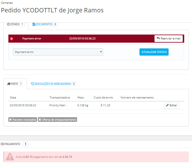 selectshop.at Posted March 22, 2018 Share Posted March 22, 2018 Vc. nao é o único. Veja a resposta aqui no fórum Inglês: https://www.prestashop.com/forums/topic/590866-get-status-payment-error-after-receiving-a-payment-with-paypal/ Acerte a configuracao da sua loja como lá indicado: => Go to preferences => General => Rounding rule: Round to infinity when the value is halfway (recommended) => Rounding Type: Rounding for each item Link to comment Share on other sites More sharing options...