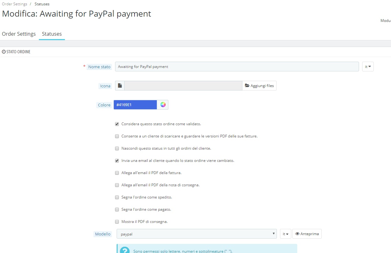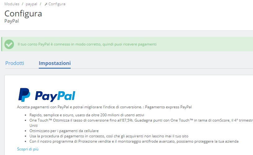 fiore Posted March 26, 2018 Share Posted March 26, 2018 PS 1.7.2.4 Tema: classic Sto testando se PS accetta gli ordini. Con Bonifico bancario mi segna l'ordine accettato ed invia l'email al cliente. Con paypal sebbene mi invia alla pagina di paypal e nel BO di Prestashop mi dice che paypal è impostato correttamente, l'ordine non viene visualizzato in prestashop e non viene inviata l'email. Io ho creato l'email paypal sia in inglese sia in italiano e l'ho caricata via ftp. Il modulo Paypal è l'ultimo aggiornato. Qui sotto le immagini. Cosa devo fare in PS per fargli accettare gli ordini in attesa di pagamento anche con Paypal? Link to comment Share on other sites More sharing options...