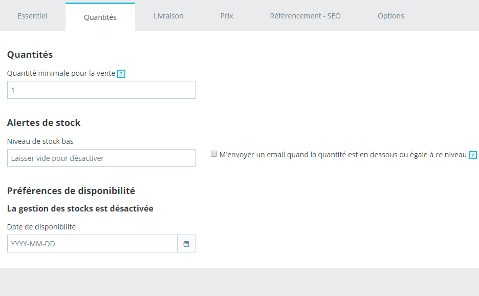 nanounette Posted March 27, 2018 Share Posted March 27, 2018 bonjour a tous, j ai installer prestashop 1.7.3.0 dans la fiche produit je ne trouve pas "declinaisons" je suis censée trouver cela dans "quantité" selon le guide prestashop, mais je n ai rien qui fasse reference aux declinaisons dans quantites. il faut selectionner "produit avec declinaisons" au lieu de produit simple, mais je n ai que : produits standards + pack de produits + produit dematerialisé. je n ai pas "produit declinaisons". (voir photo ci dessous) je precise que dans "parametres de la boutique" j ai bien activer produit avec declinaisons. et il y a bien des attributs et valeurs dans le bo. pourriez vous m aider? merci bien Link to comment Share on other sites More sharing options...