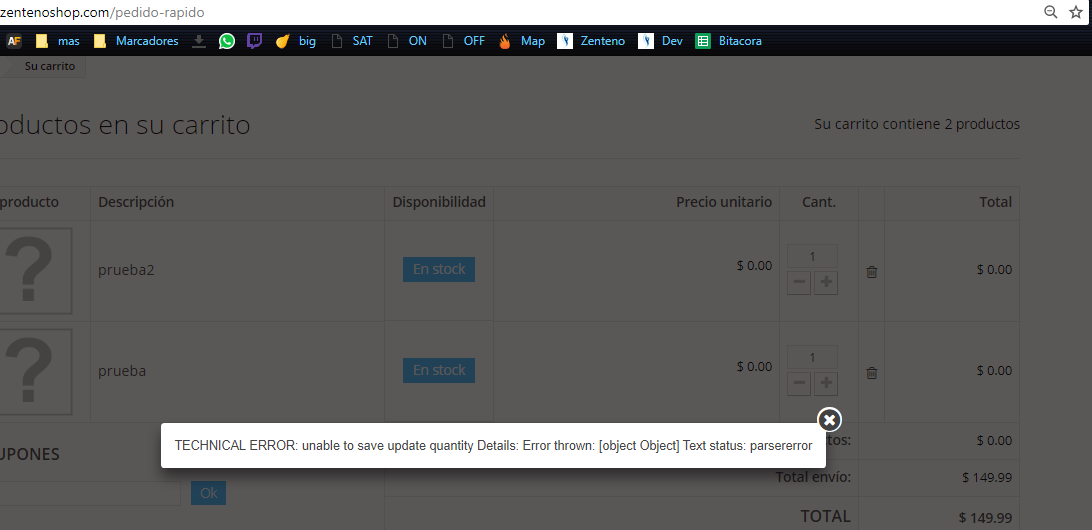 tecnopak Posted March 28, 2018 Share Posted March 28, 2018 Hola he tenido muchos problemas con este error hay alguna forma de arreglarlo. me pasa cuando en la pagina de pedido intento cambiar el transportista o eliminar un producto del carro. ahora he leido muchisisimos foros pero nuguno ayuda. intente: actualizar el idioma borrar el idioma y reinstalarlo quitar url amigables vaciar cache modificar el ccc reinstalar el tema borrar los transportistas y volverlos a crear las traducciones una por una las abri con notepad++ y guardarlas en el formato correcto. es que no se que mas hacer me urge solucionarlo. Link to comment Share on other sites More sharing options...