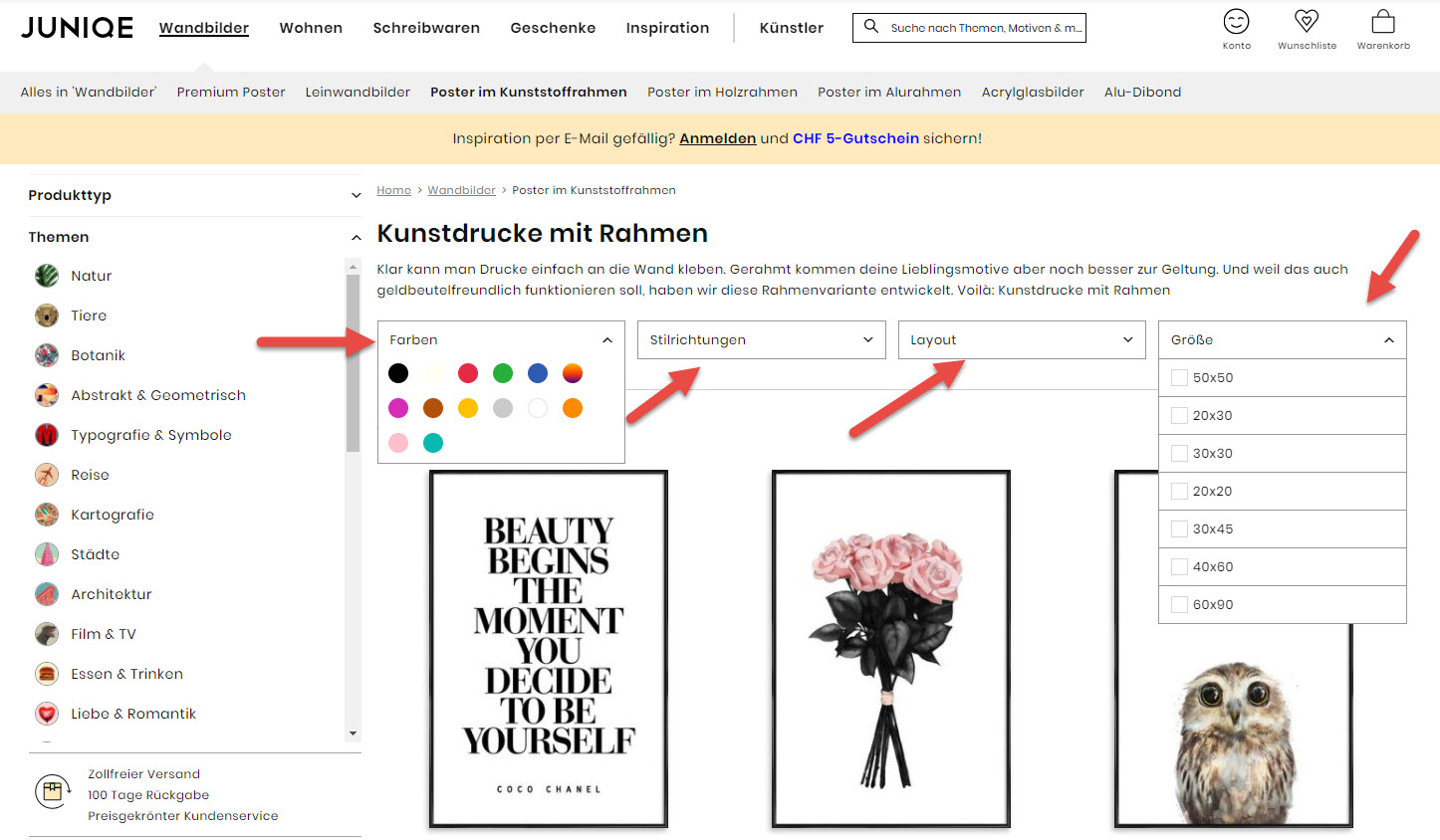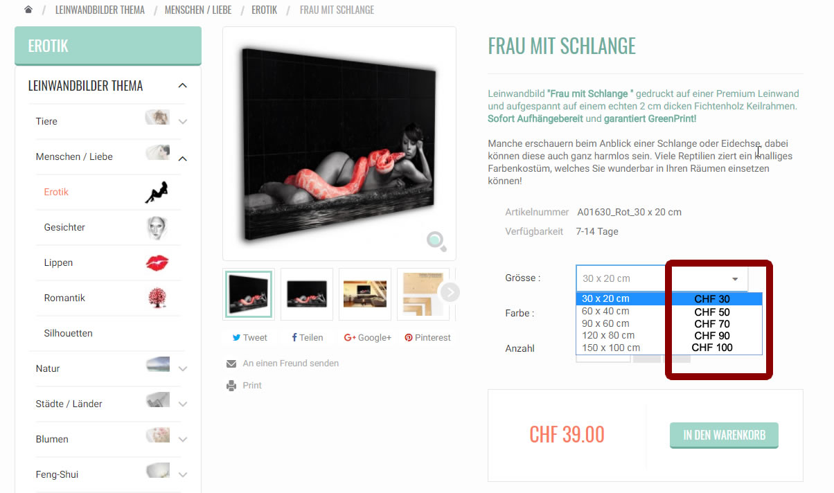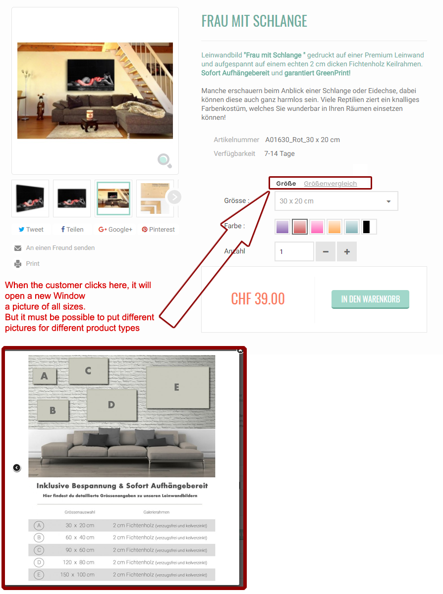 Schlee Posted March 29, 2018 Share Posted March 29, 2018 Hi I do have several amendmends to do at the Product page. Is it possible to handle this with a module (doesn't matter how expensive) 1. Is there any chance to to a block layered at the top? Similar like here: https://www.juniqe.ch/wandbilder/gerahmte-poster 2. We are selling pictures in different formats. We want to put a Link that they can click and a screenshot appears with the different sizes (see below example). But we need to be able to change pictures for the different formats. 3. Is it possible to but in the dropdown, next to the different sizes the final price? Many many Thanks Schlee Link to comment Share on other sites More sharing options...
