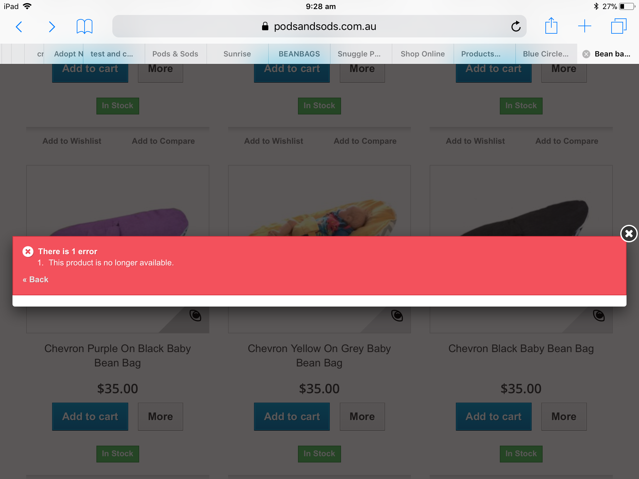 Ava123 Posted March 29, 2018 Share Posted March 29, 2018 Everything was working fine, but now I have a huge problem. When I click on an item in my newborn bean bags, it comes up with ‘this item is no longer available ‘ yet it show as ‘in stock’. If I click the add to cart it goes through and adds it. I don’t know who to fix this and it is happening on all the bags. Please help. Link to comment Share on other sites More sharing options...