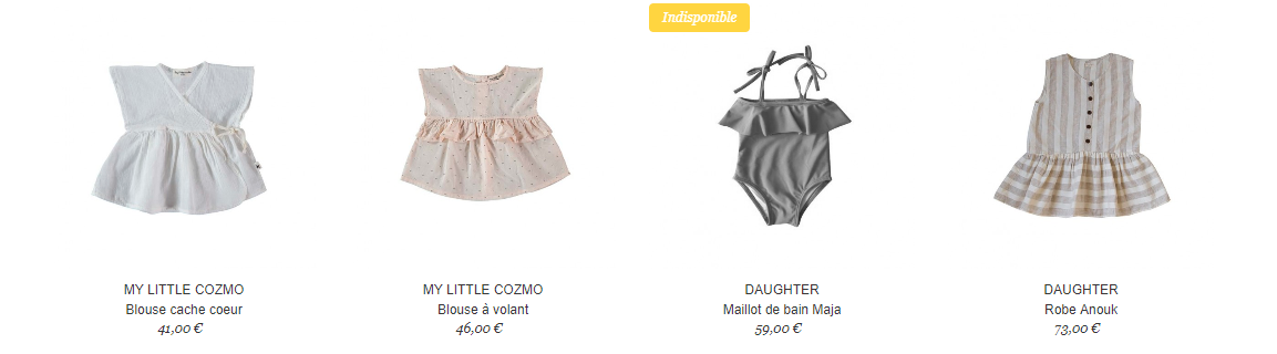 Margaux M Posted March 30, 2018 Share Posted March 30, 2018 Bonjour, Je suis à la recherche d'une solution pour griser les images dans la product_list des produits qui sont en rupture de stock. CF pièce jointe. J'ai essayé de "tricher" en modifiant mon étiquette indisponible, la faire grise et de la taille de l'image et changer l'opacité afin de "désaturer " les couleurs de la photo du produit, mais du coup je ne peux plus cliquer sur l'image pour accéder à la fiche produit! Votre aide est la bienvenue! D'avance merci! Link to comment Share on other sites More sharing options...