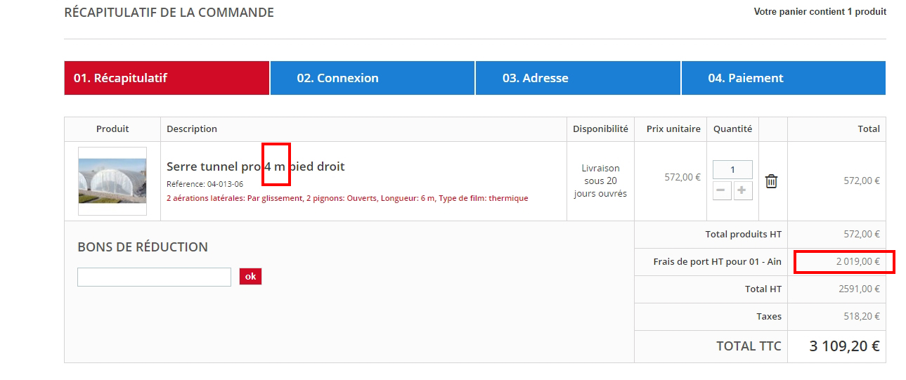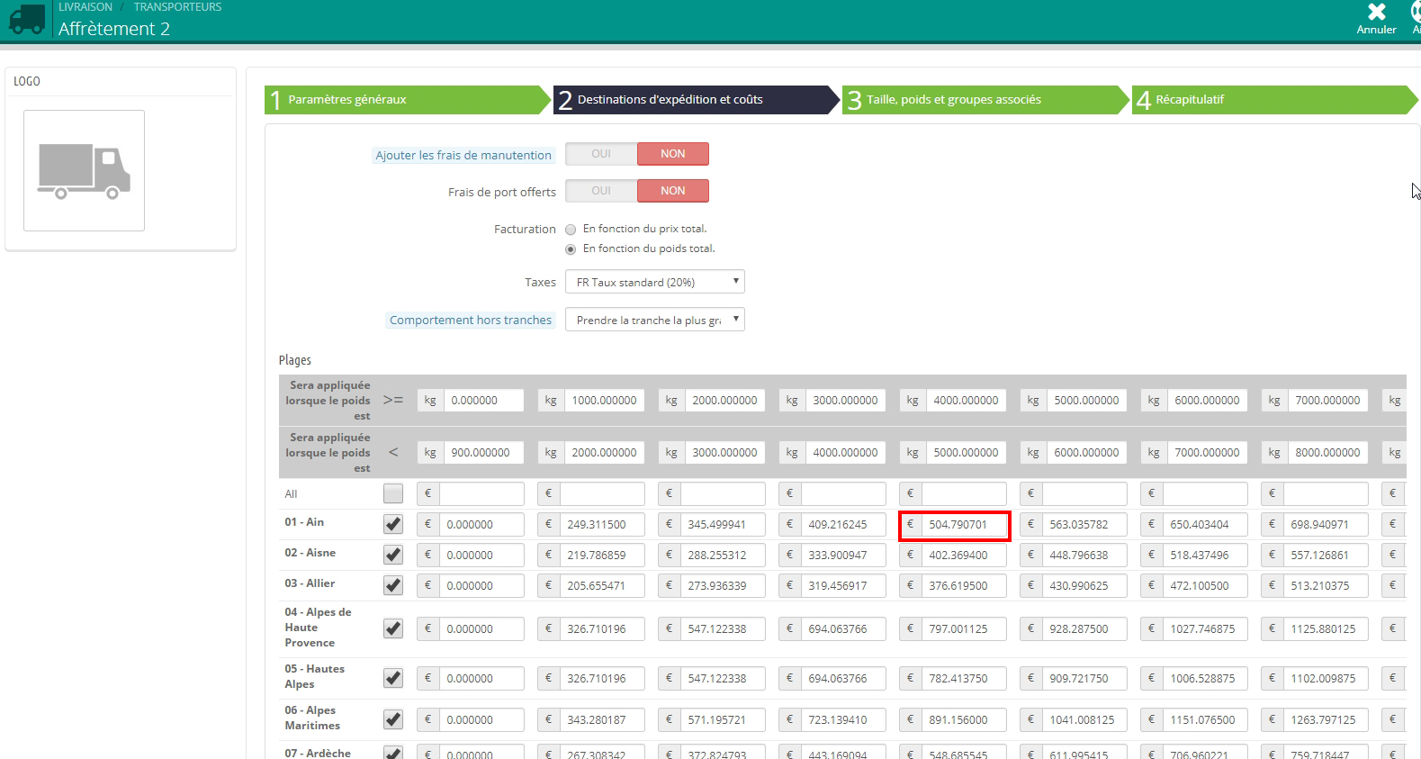 maarine1404 Posted April 6, 2018 Share Posted April 6, 2018 Bonjour, J'ai un problème avec mes transporteurs, Voilà, j'ai des produits qui sont très longs et très lourds, donc j'ai créé un transporteur particulier (nous travaillons en mètres de plancher donc 4000 kg correspond à 4 m de plancher) Si j'ai fait des tranches aussi importante c'est pour permettre à mes clients de commander d'autres produits en plus de celui qui est lourd sans impacter le prix de livraison. Le problème est que lorsque je mets un produit dans mon panier le prix de livraison se multiplie par la taille du produit (ci-joint des impim' écran pour expliquer le problème) : Le produit a multiplier le prix de livraison du département de l'Ain par sa taille (x4) autre exemple : Pouvez-vous m'aider à résoudre le problème ? Je ne trouve rien dans le code qui créer ce problème ! et j'ai d'autres transporteurs qui fonctionne très bien. Je vous remercie d'avance pour vos réponses. Alice Link to comment Share on other sites More sharing options...