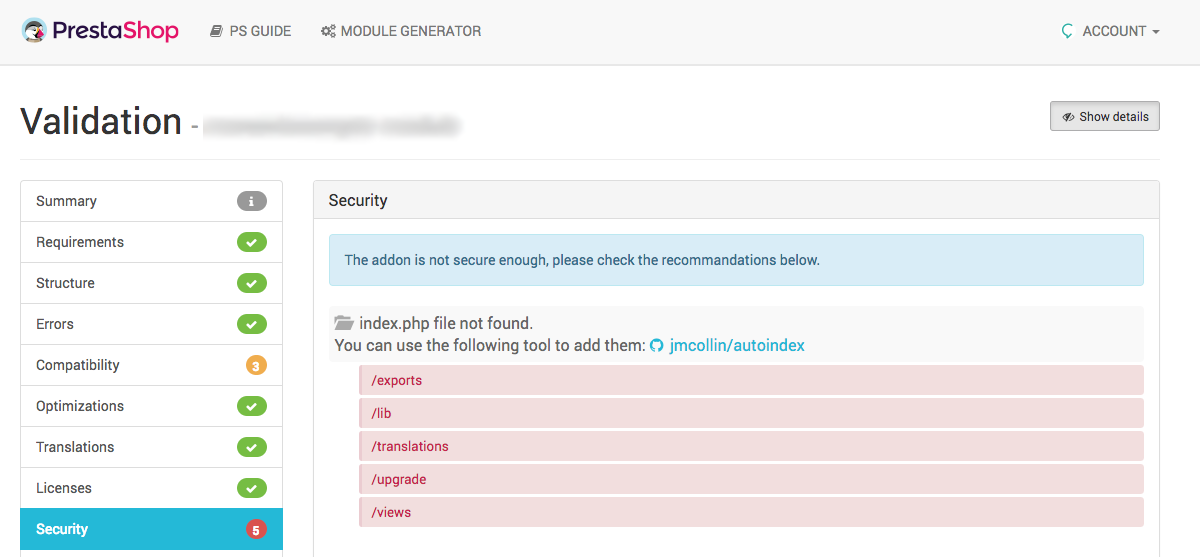 Prestashop Validator - 5 erreurs de sécurité concernant l'absence de fichiers index.php pourtant déjà présents