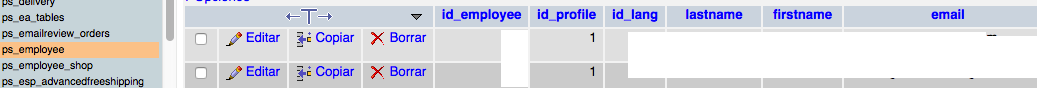 David Calabuig Posted May 3, 2018 Share Posted May 3, 2018 (edited) Hola @Mayuki Puedes ir a la base de datos en phpmyadmin y vas a la tabla ps_employee y verás los usuarios que están registrados en el backoffice de Prestashop. (adjunto captura) Ahi tienes varias opciones: Ves el correo del admin y recuperas la contraseña desde el panel de acceso al backoffice Cambiar el correo a uno tuyo y luego recuperas la contraseña desde el panel de acceso al backoffice Saludos Edited May 3, 2018 by nest4 subir captura correcta (see edit history) Link to comment Share on other sites More sharing options...