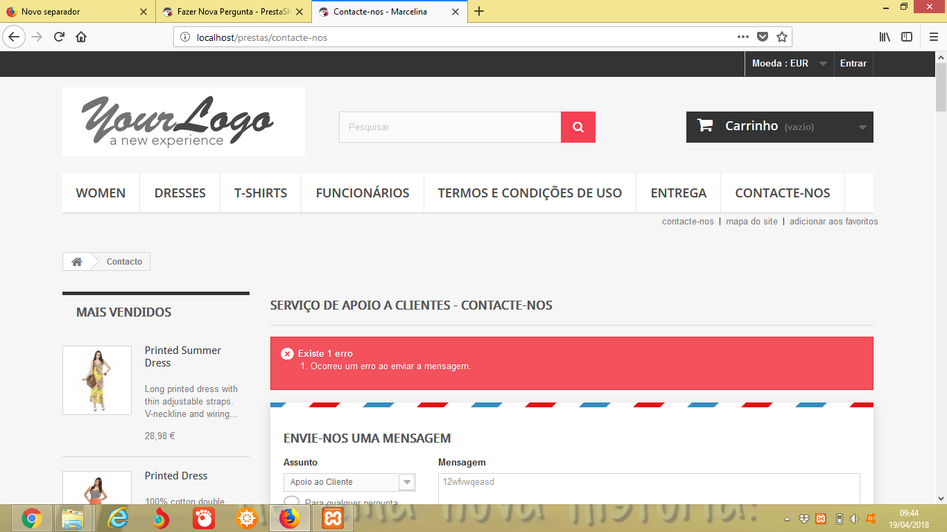 Cesario Posted April 19, 2018 Share Posted April 19, 2018 Saudações caríssimos! eu estou com um pequeno problema na minha loja, sempre que qualquer cliente tenta submeter a página de contacte-nos(serviço de apoio Cliente) na primeira tentativa sempre aparece esse erro que ilustra a imagem, mas quando submeto pela segunda vez a mensagem é enviada normalmente. como posso fazer para que a mensagem seja enviada logo no primeiro instante de modo a não aparecer mais nenhum erro??? Link to comment Share on other sites More sharing options...