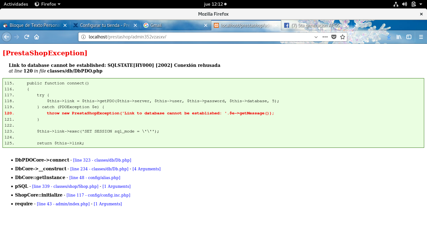 Profe Tapia Posted April 19, 2018 Share Posted April 19, 2018 Buenas tardes, aqui batallando de nuevo, hay un error a la hora de entrar al backoffice de la tienda (en xampp). Por favor! ayuda! Link to database cannot be established: SQLSTATE[HY000] [2002] Conexión rehusadaat line 120 in file classes/db/DbPDO.php Link to comment Share on other sites More sharing options...