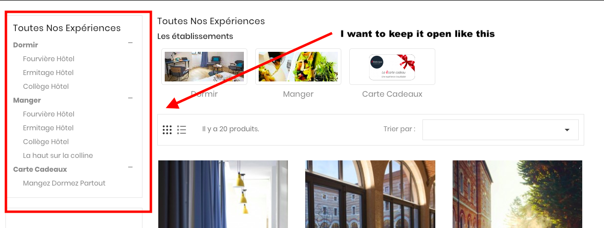 John Posted April 23, 2018 Share Posted April 23, 2018 (edited) Hi everyone, I would like to have the category tree on the left side of the site stay open. For the moment I have to click on the "+" button to expend it. I try as many tutorial as I found on google but nothing works really. Do you have any solution to keep it expend all the time? I use PS 1.7.2 Thanks in advance. Edited April 23, 2018 by John (see edit history) Link to comment Share on other sites More sharing options...
