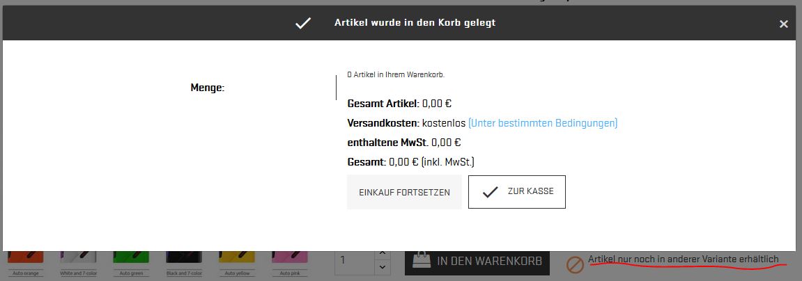 3) Manchmal kommt es vor, dass Produkte, die gar keine Varianten haben, als out of stock angezeigt werden - zusammen mit dem Hinweis, dass der Artikel nur noch in einer anderen Variante verfügbar ist. Das ergibt überhaupt keinen Sinn.