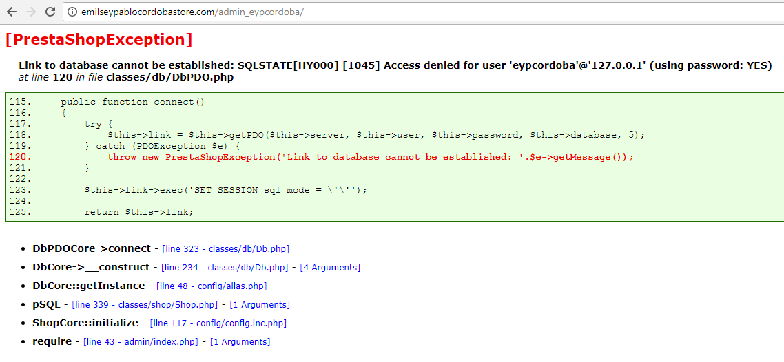 Matias Posted May 3, 2018 Share Posted May 3, 2018 (edited) Hola como andan? El error que me da prestashop es el siguiente: El error me acaba de aparecer porque he trasladado del localhost a un hosting y no puedo entrar al back-office. En settings.inc.php me aparecen 2 lineas de codigo Link to database cannot be established: SQLSTATE[HY000] [1045] Access denied for user 'eypcordoba'@'127.0.0.1' (using password: YES)at line 120 in file classes/db/DbPDO.php Gracias de antemano. Edited May 3, 2018 by nadie Moderación edita el título del tema para ser más descriptivo con la duda (see edit history) Link to comment Share on other sites More sharing options...