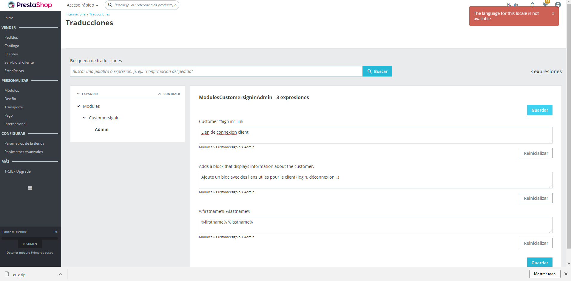 acsilva Posted May 3, 2018 Share Posted May 3, 2018 Hola buenas, tengo dos problemas en relación a los idiomas, tengo Español, Inglés Catalán, Euskera, Gallego y Francés activos. El primer problema es que cuando accedo a Traducciones y voy a traducir un cualquier contenido en Francés, no puedo ni reinicializar ni guardar valores siempre aparece un mensaje en rojo en la parte derecha que indica "The language for this locale is not available", añado captura En cambio para cualquier otro idioma me deja, he creado el francés como fr y fr-fr en idiomas. También probé con fr y fr-ca pero sucede lo mismo. Por otro lado, el otro problema, es que cuando escojo en el frontend otro idioma, algunos menus no salen traducidos: Por ejemplo en catalan vemos que: Estan bien traducidos los menus indicados y en frances, no salen bien: En los menus inferiores igual, por ejemplo, en catalan aparece: Como véis mezcla Castellano, Catalán, Ingles.... algunos puedo modificarlos en Paginas, pero donde puedo modificar el resto de menus y paginas? Gracias de antemano. Link to comment Share on other sites More sharing options...