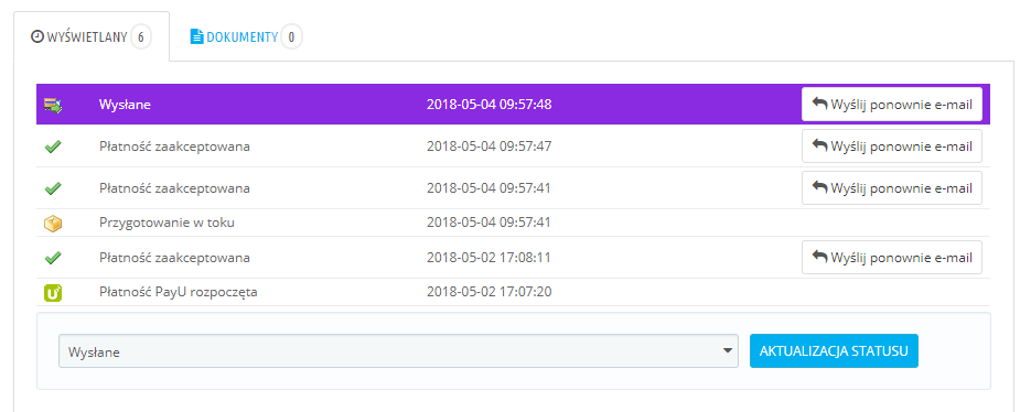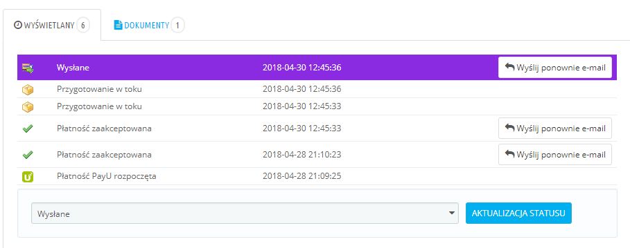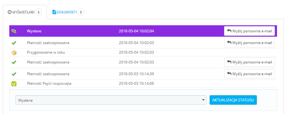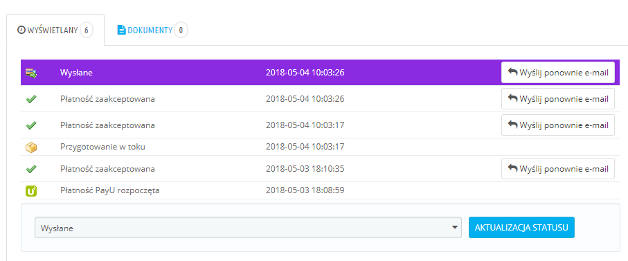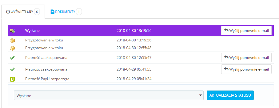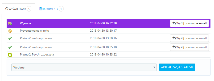 Pracuję na preście 1.6.1.17, wtyczki które ewentualnie zmieniają statusy to PayU oraz FurgonetkaBiznes. Jednakże jak widać na zrzutach ekranu problem występuje również w przypadku ręcznej zmiany statusu.