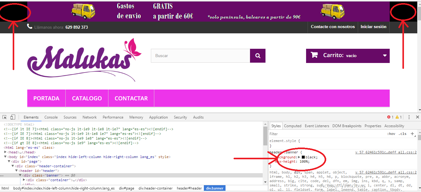 nadie Posted May 6, 2018 Share Posted May 6, 2018 En 5/5/2018 a las 12:52 PM, Racos81 dijo: Buenas tardes, mi problema es que no encuentro la ruta en el ccpanel para cambiar el color negro de los dos recuadros del banner superior, he intentado averiguar la ruta con el inspeccionar elementos pero no se como hacerlo Buenas noches, buenos días, buenas tardes Te lo comento para las próximas veces, cuando ves que te aparecen ficheros cache css al inspeccionar elemento, es porque tienes activado en la pestaña Parámetros Avanzados -> Rendimiento la opción de "Smart cache" para las hojas de estilo (CSS) activada, si la desactivadas podrás ver los ficheros CSS desde inspeccionar elemento, lógicamente después déjala activada, ya que es recomendable para temas de rendimiento. Por lo que veo usas Prestashop 1.6 con la plantilla por defecto. Lo que indicas en la captura, es en el fichero: /themes/default-bootstrap/css/global.css Cambiando el valor del "background" en esta parte del código: header .banner { background: black; max-height: 100%; } por el color de fondo que quieras para esa parte. Link to comment Share on other sites More sharing options...
