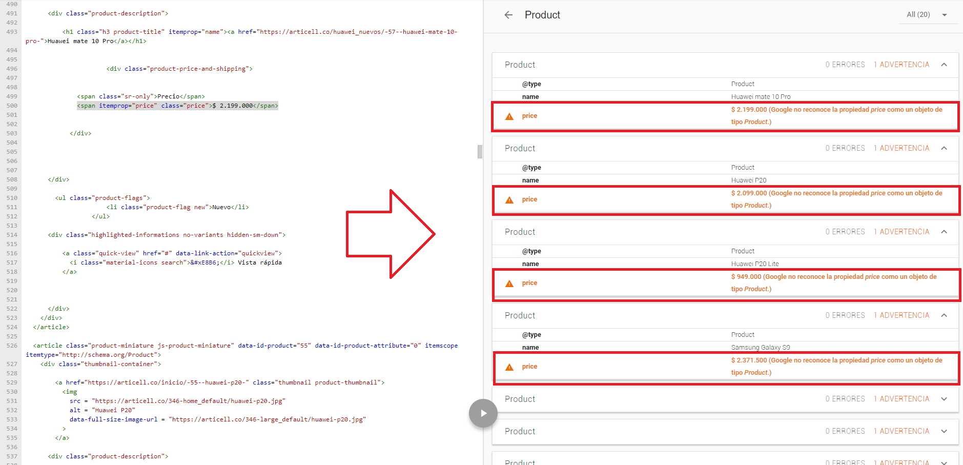 A través de las herramientas de google, hice unos análisis de datos estructurados de mi tienda con la plantilla actual de prestashop 1.7.3 y aparecen las siguientes advertencias.