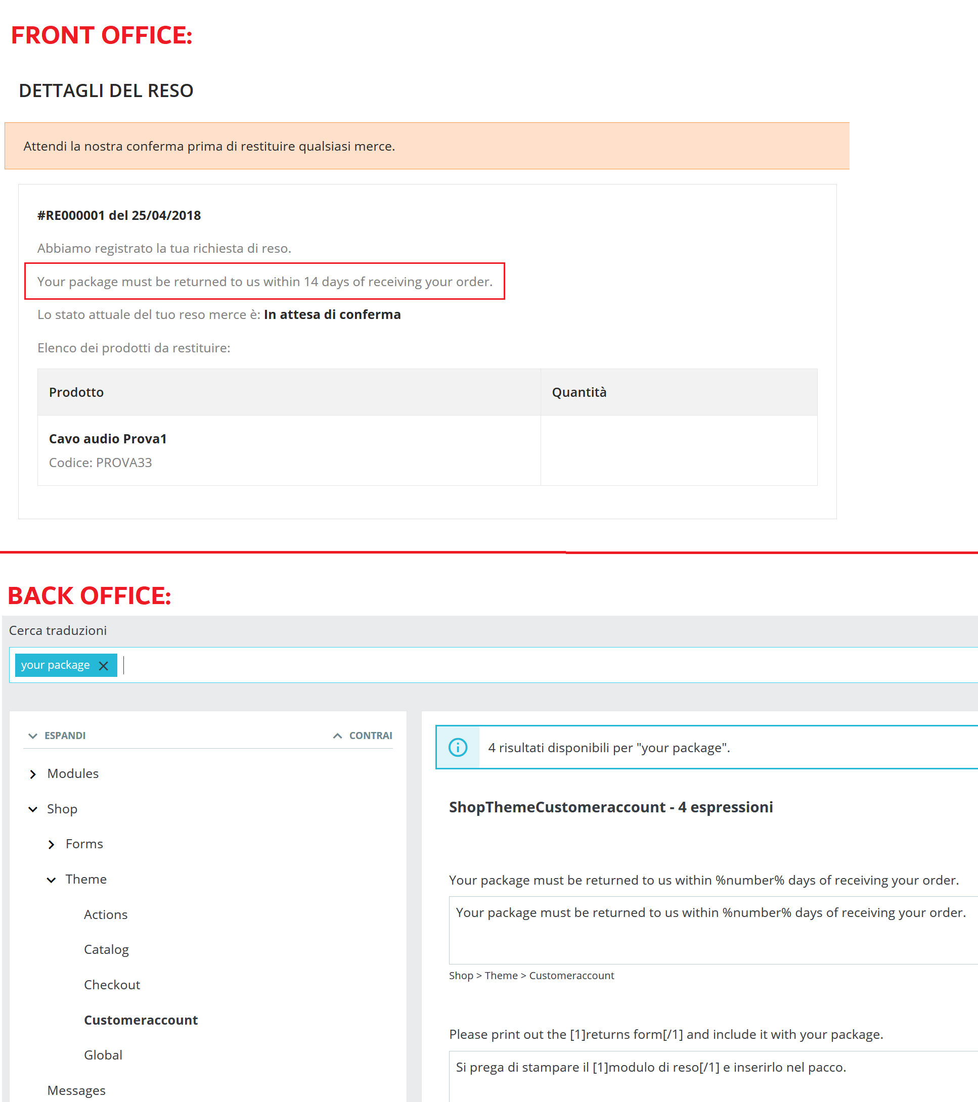 Daniele Posted May 9, 2018 Share Posted May 9, 2018 Ciao a tutti, sto costruendo un e-commerce con PrestaShop v.1.7.3.0 e il tema Kitchen acquistato sul sito PrestaShop (qui il template: https://addons.prestashop.com/demo/FO19488.html). Il mio problema è che non riesco a tradurre 3 parti in italiano: 1) il menu verticale (CZ - Vertical Menu v1.0.4 di Codezeel) visualizza 11 categorie. Dalla 12ima categoria in poi, appare in basso nel menu la dicitura "View more" in inglese. Non riesco a capire come tradurla. Ho guardato nel relativo modulo e nella sezione Traduzioni del Back Office ma non trovo niente. 2) Nel riepilogo d'ordine mi rimane il seguente paragrafo in inglese. Non riesco a trovarlo da nessuna parte nel Back Office, sezione Traduzioni. Qualcuno sa dov'è? "Please specify your order reference ... in the bankwire description. We have also sent you this information by e-mail. Your order will be sent as soon as we receive the payment. If you have questions, comments or concerns, please contact our expert customer support team." 3) Nella procedura di reso mi rimane la seguente frase in inglese. L'ho individuata nel Back Office ma quando vado a tradurla e poi salvo, la traduzione viene persa. Come posso fare? "Your package must be returned to us within 14 days of receiving your order." Allego immagini. Grazie, Daniele Link to comment Share on other sites More sharing options...