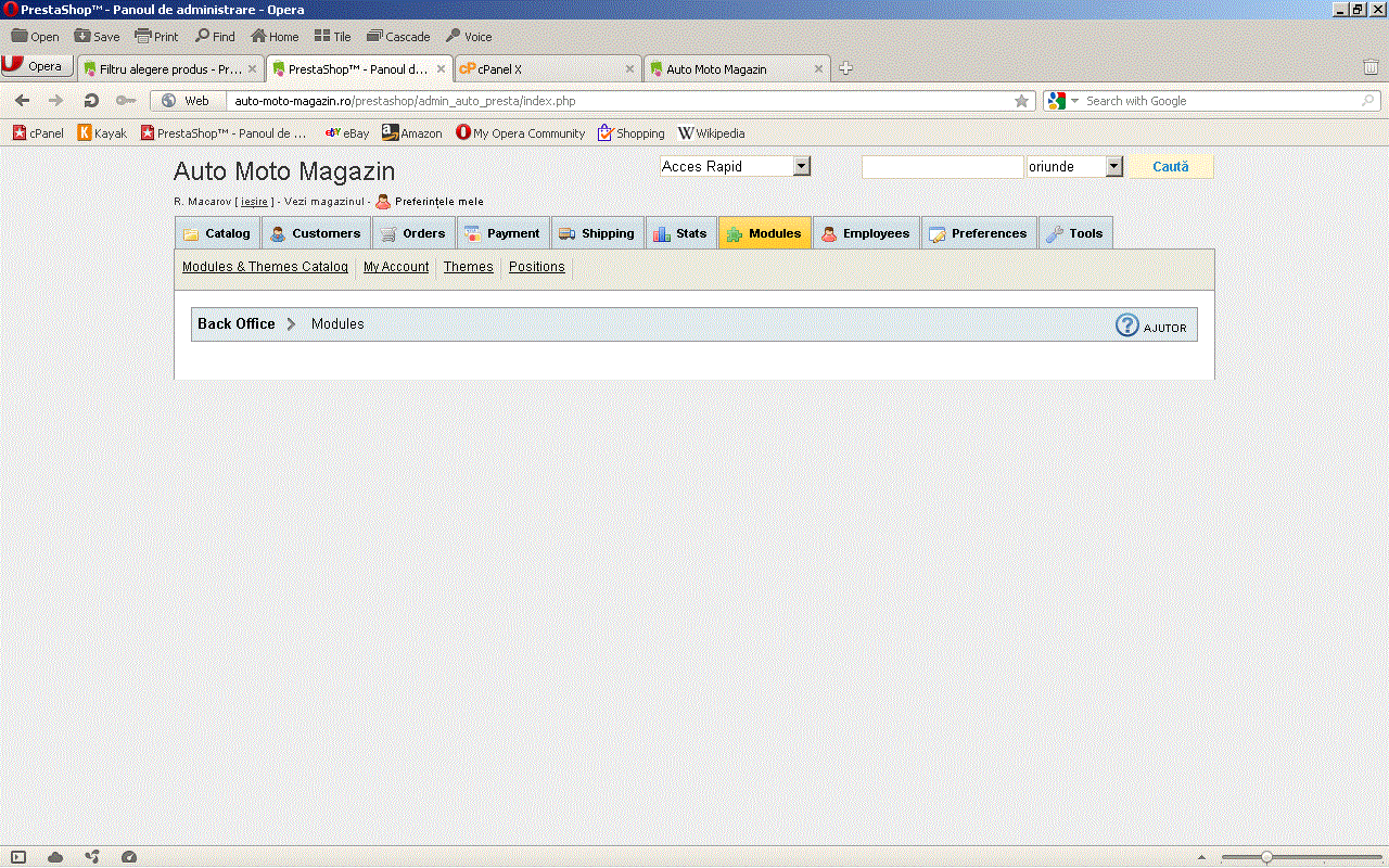 Rares Posted January 13, 2012 Share Posted January 13, 2012 Am o mare problema: am incarcat (nici n-am apucat sa-l si instalez) modulul acesta si acum in BO, la Modules, nu mai am nimic, au disparut toate modulele. Cum pot sa revin? Mentionez ca am facut restore la baza de date initiala si degeaba... Asa arata in BO sectiunea Modules acum: Link to comment Share on other sites More sharing options...