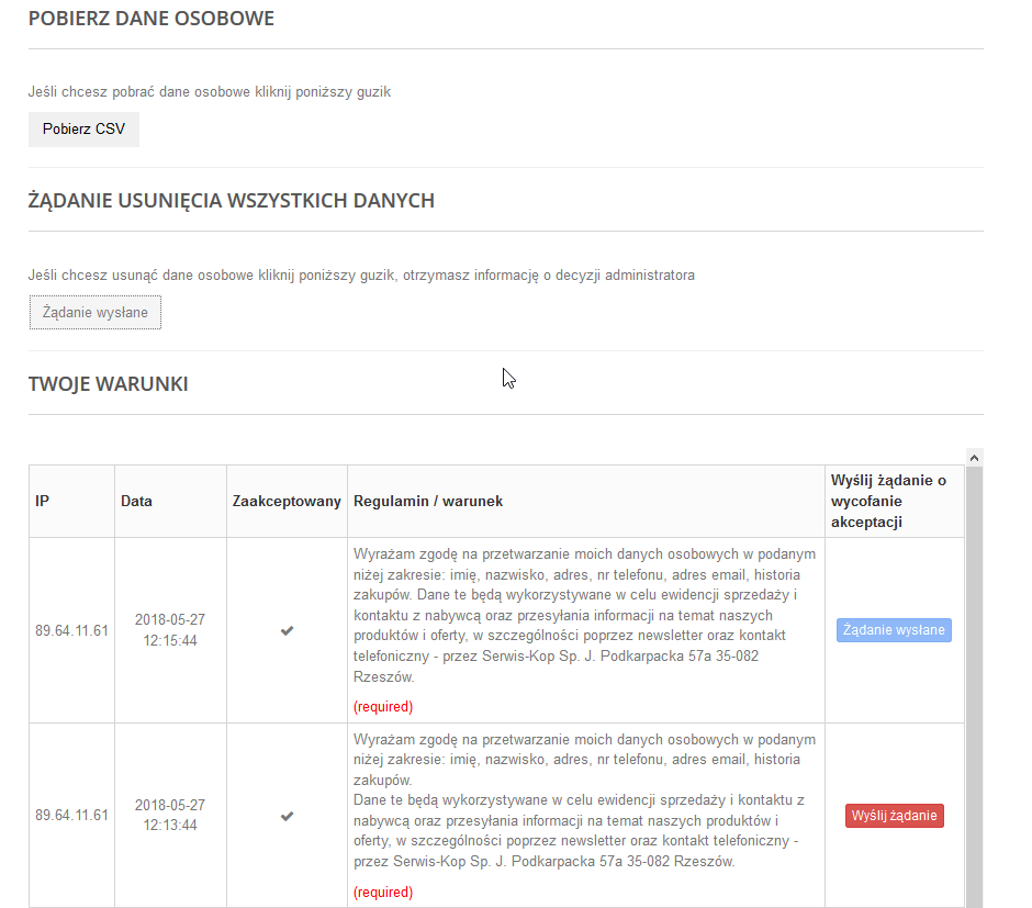 Accepted consent by the client, which will then be withdrawn by him, goes to the list of conditions pending withdrawal. The store administrator may withdraw the consent of customers who have asked for it. After approval of the withdrawal of consent by the administrator, this consent goes to the list of withdrawn conditions. The consent after its withdrawal is again visible in the store and works as it was set up, e.g. it can log out the customer from the store if he does not accept it again.