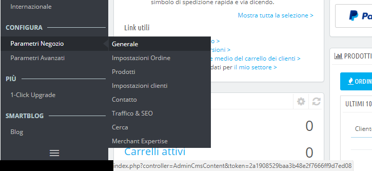 luca2603 Posted May 18, 2018 Share Posted May 18, 2018 (edited) Ciao a tutti, ho notato che da quando ho installato sul sito la versione 1.7.2.4, il tab GENERALE nel menu del BO risulta sbagliato. Invece di linkarmi alla pagina delle impostazioni generali del mio shop online, mi apre il sottomenu CMS. Ho appena eseguito l'aggiornamento alla versione 1.7.3.2 sperando si risolvesse e invece niente da fare. Ho provato a ricaricare il primo backup del sito ma anche quello riporta gli stessi link nel menu del BO. Ho provato a cercare qua e là un po di info in merito ma non ho trovato nulla. Vi allego lo screen del problema. Sapete come si può sistemare il problema? Perchè ogni volta mi tocca modificare il link nella barra degli indirizzi e sinceramente è un pò una scocciatura. Grazie a tutti Edited May 18, 2018 by luca2603 (see edit history) Link to comment Share on other sites More sharing options...
