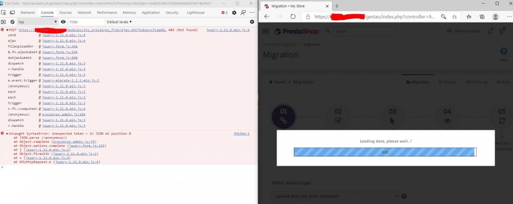 [email protected] Posted October 13, 2020 Share Posted October 13, 2020 On 9/10/2020 at 7:56 PM, peroxido said: Hello, We need to migrate all data of a big ecommerce from Prestashop 1.6.1.4 to 1.7.6.7, we decided to give your plugin a go. Our test servers are all configured according to your announced specifications, php version extensions and configurations all ok. We started testing the free versions 2.1.4 yesterday on 2 test subjects on 2 different servers. We decided to go with the export data file on source and import on target, the data export on source website runned ok however no matter what server or settings the import data on both targets (fresh installs of prestashop 1.7.6.7) always gets stuck on Loading data at 99% (one of the tries left on overnight), nothing on server logs only the console error in attachment. Can you please advise on this, If succeeded we will buy your plugin.. The same problem. Could you resolt it?? Link to comment Share on other sites More sharing options...