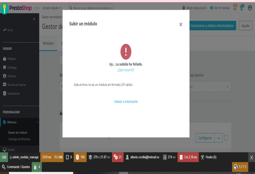 Cristina2161 Posted January 15, 2021 Share Posted January 15, 2021 6 hours ago, ets-soft said: Hello, Thank you for using our Prestashop Migrator free module. We're really sorry about the problem you encountered while using our module. To help us understand your problem better, could you please turn on the "Debug mode" of your website, install the latest version of Prestashop Migrator free (v2.1.4), and take a screenshot of any error notifications that appears? I'm looking forward to hearing from you soon. My best regard. ========================= Hola, Gracias por utilizar nuestro módulo gratuito Prestashop Migrator. Lamentamos mucho el problema que encontró al usar nuestro módulo. Para ayudarnos a comprender mejor su problema, ¿podría activar el "modo de depuración" de su sitio web, instalar la última versión de Prestashop Migrator gratis (v2.1.4) y tomar una captura de pantalla de cualquier notificación de error que aparezca? Espero tener noticias tuyas pronto. Mi mejor saludo. Hola este es el error. Link to comment Share on other sites More sharing options...