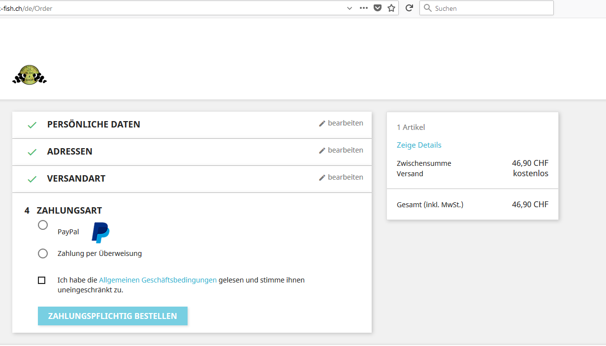 Mexxat Posted May 24, 2018 Share Posted May 24, 2018 ich habe einen Webshop mit Prestashop V 1.7.3.2 Soweit läuft die Einrichtugn recht gut. Ich versuche nun mal "Dummy" Bestellung zu machen. Wenn man auf im Warenkorb auf "Kasse" klickt kommt man zur "Orders" Seite. Leider ist dort dann kein Banner und auch kein Footer mehr zu sehen. Ist das normal bzw wo kann man das aktivieren? Ich verwende aktuell das Standard Template! Gruss und Danke für Tipps Link to comment Share on other sites More sharing options...