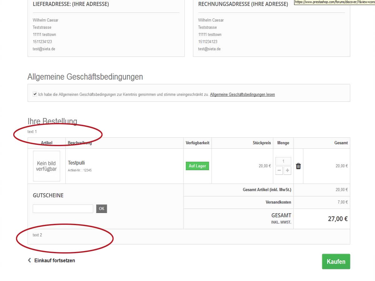 SliderFlash Posted May 28, 2018 Share Posted May 28, 2018 (edited) Prestashop Version 1.6 Kann bitte jemand helfen? Unter dem Modul "Europäische Rechtssicherheit" gibt es zwei Textfelder untereinander , " Freitext 1 (über Bestellübersicht) " und " Freitext 2 (über Bestellübersicht) ". Aber wen ich Text einfüge und speichere wird der Text weder in der Bestellübersicht oder noch in E-Mail angezeigt. ..........Wo wird der Text angezeigt? , Danke Gruß Edited May 28, 2018 by SliderFlash (see edit history) Link to comment Share on other sites More sharing options...