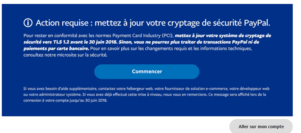 sidoja Posted June 8, 2018 Author Share Posted June 8, 2018 (edited) bonjour, peut-être que c'est en rapport avec le message sur le compte paypal quand on s'y connecte : mais c'est à partir du 30/06 mais depuis hier... Edited June 8, 2018 by sidoja (see edit history) Link to comment Share on other sites More sharing options...