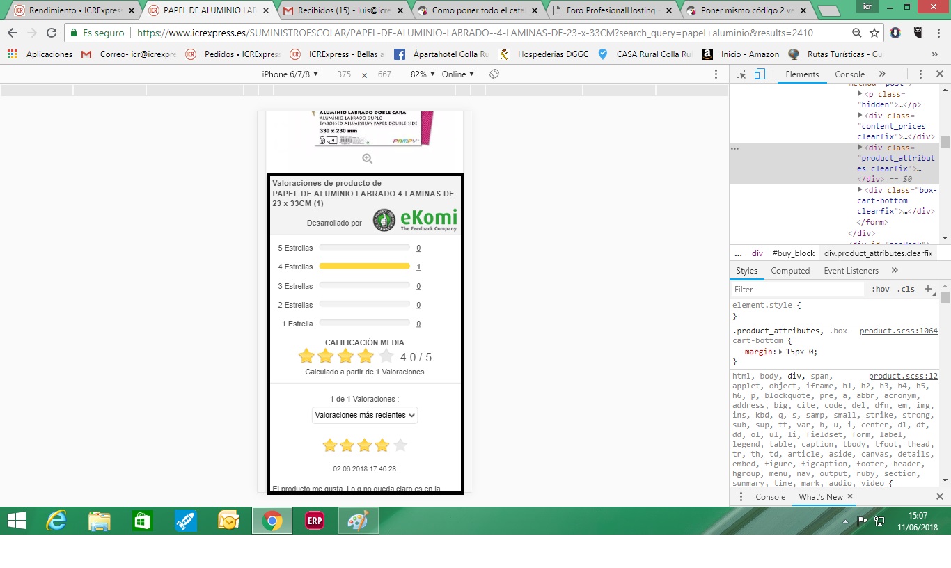 Luis Álvarez Posted June 7, 2018 Share Posted June 7, 2018 Hola, mire necesito ayuda porque he instalado unos códigos de valoraciones (ekomi), un artículo de referencia es el 216294 (https://www.icrexpress.es/SUMINISTROESC ... -23-x-33CM), en ese artículo podréis comprobar que las estrellitas están debajo del título, y la vista de valoraciones lo he puesto debajo de las imágenes para que salga estéticamente bien, esto en el product.tpl y en el product-list.tpl también he puesto para que se viera la estrellita de valoraciones, mi problema es que en la página del producto (donde puedes comprar el artículo la url de arriba) sale muy bien el bloque de comentario de las valoraciones y la estrellita, justo debajo de la imagen, pero en la versión del móvil queda muy mal estéticamente (sale primero la imagen, los comentarios y luego la información los precios, etc del producto), sabríais como separar cada código, es decir, el código ponerlo como 2, uno para que se aplique solo a la pagina web (dejarla como esta) y otra para que solo se aplique a la versión del móvil para así ese mismo código ponerlo un poco más abajo y no moleste tanto pero sin que llegue a afectar a la versión web, es decir, en la web del escritorio que se quede así, pero que en la versión del móvil ese mismo código se muestre mas abajo del product.tpl y no debajo de la imagen muchas gracias, quedo atento a vuestra respuesta. Link to comment Share on other sites More sharing options...