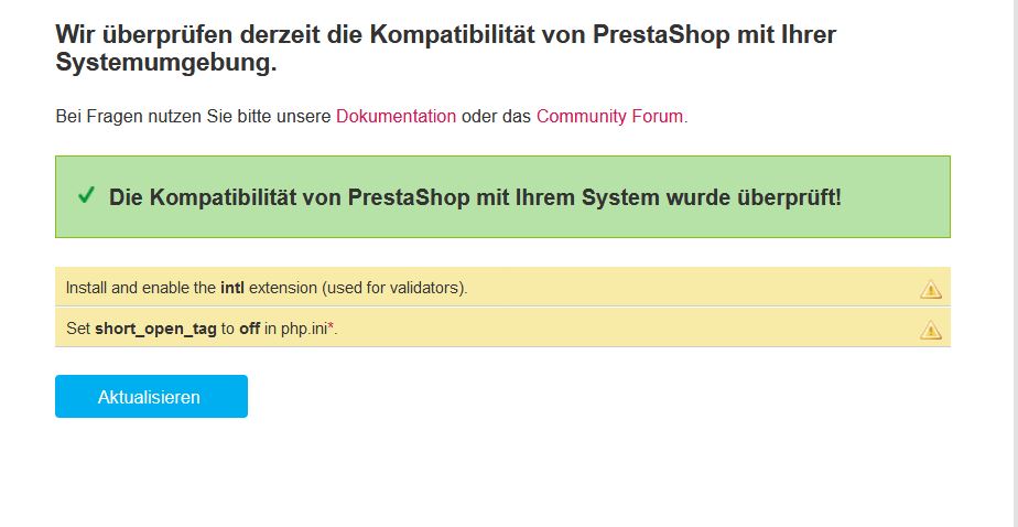 SliderFlash Posted June 9, 2018 Share Posted June 9, 2018 (edited) bei der installation Prestashop erschien installfehler, siehe Bild leider verstehe ich das nicht ganz. "short_open_tag to off in php.ini"......soll es auf on gestellt werden ? "intl extension"...was ist eine intl ? Edited June 9, 2018 by SliderFlash (see edit history) Link to comment Share on other sites More sharing options...