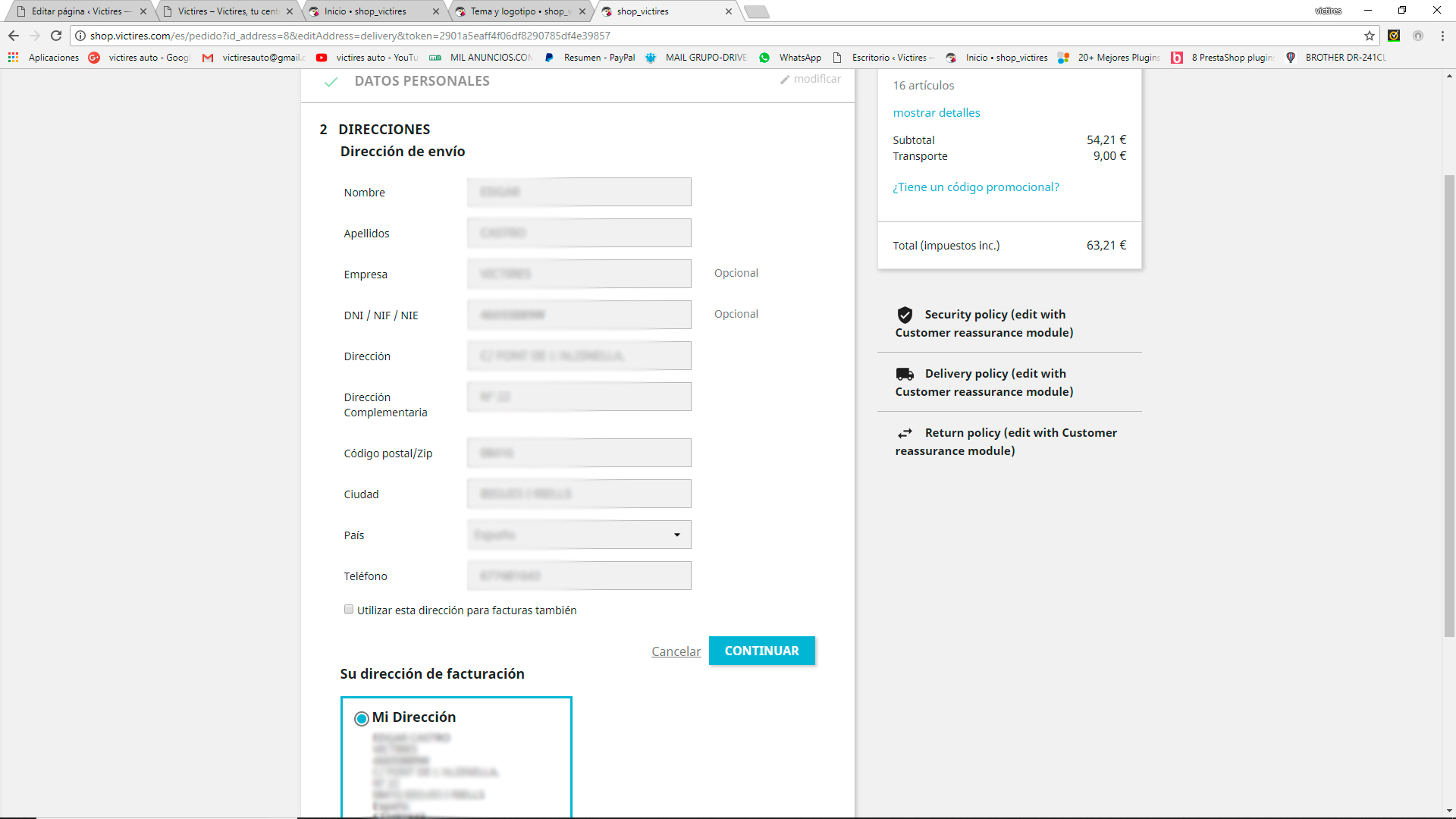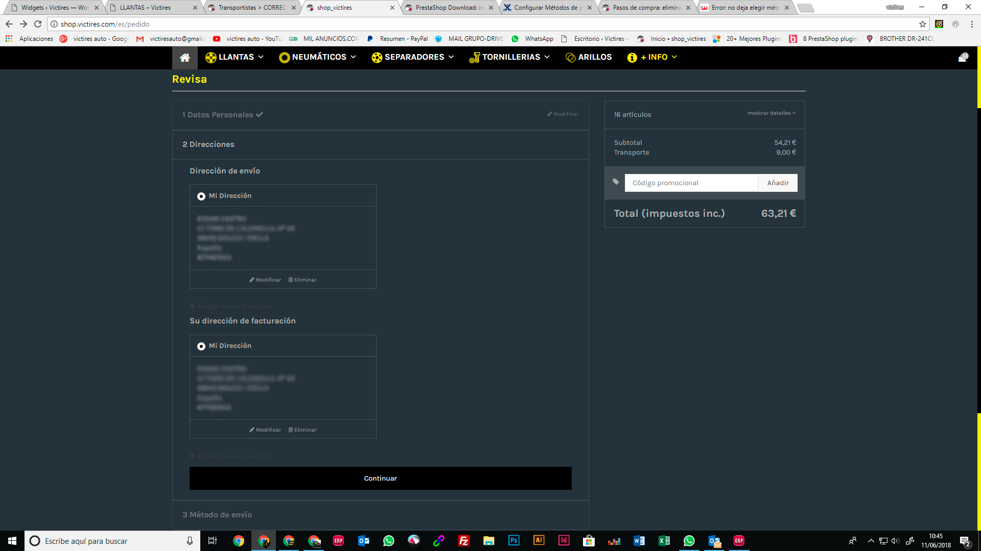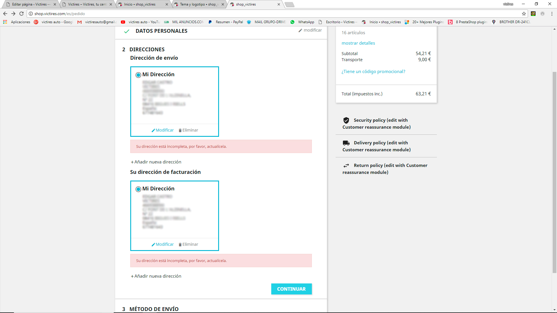 [email protected] Posted June 12, 2018 Author Share Posted June 12, 2018 hace 22 horas, aixos dijo: Hola de nuevo, En Clientes/Direcciones, Establecer los campos requeridos para esta sección, lo despliegas. Y si no lo es, entonces prueba a ver si es esto: desmarca todas las casillas de restricciones por pais, dejalo en blanco y solo deja marcado España, a lo mejor viene por ahí , puede ser que este mal asociado alguno y te afecte a todo el portal Saludos hace 23 horas, aixos dijo: En prestashop 1.7.3.3 la dirección complementaria es opcional, mira este campo porque lo he probado en una instalación limpia y sale el transportista. En "Producto" revisa las medidas peso etc. porque esto tambien afecta para que salga el tranporte o metodo de envío. En "Transportista" revisa bien las 4 fichas del transporte , 1-Configuración 2-Localización 3-Tamaño,peso etc.. 4-Resumen el precio segun destino etc... Todo esto ha de estar bien definido para que funcione correctamente. Saludos .- He activado el modo debug, que me comentabais al principio. .- Ya he quitado en las direcciones a opcional lo que no sea imprescindible, como por ejemplo el campo de empresa, CIF, y dirección 2. .- He desmarcado en las opciones de pago todas las restricciones de todos los países, y he dejado solo ESPAÑA, tanto en PAYPAL, como en TRANSFERENCIA BANCARIA .- He eliminado los transportes y he realizado uno de nuevo, solo por precio total, sin pesos ni medidas, para que no haya confusiones. Seguimos igual.... Con la plantilla de origen, me sigue saliendo que la dirección esta incompleta, aun cuando está todo relleno. y de ahi no pasa. Link to comment Share on other sites More sharing options...