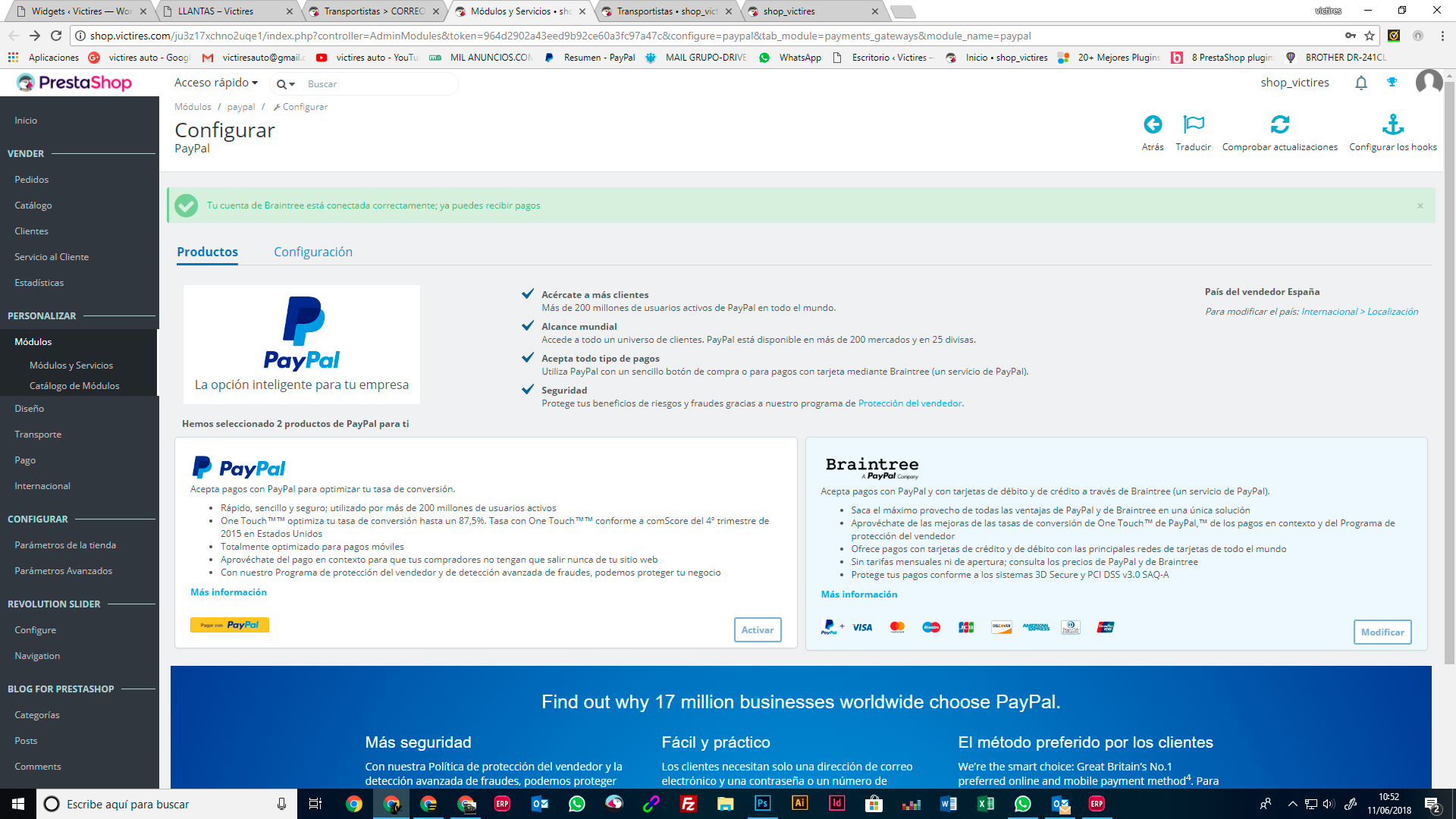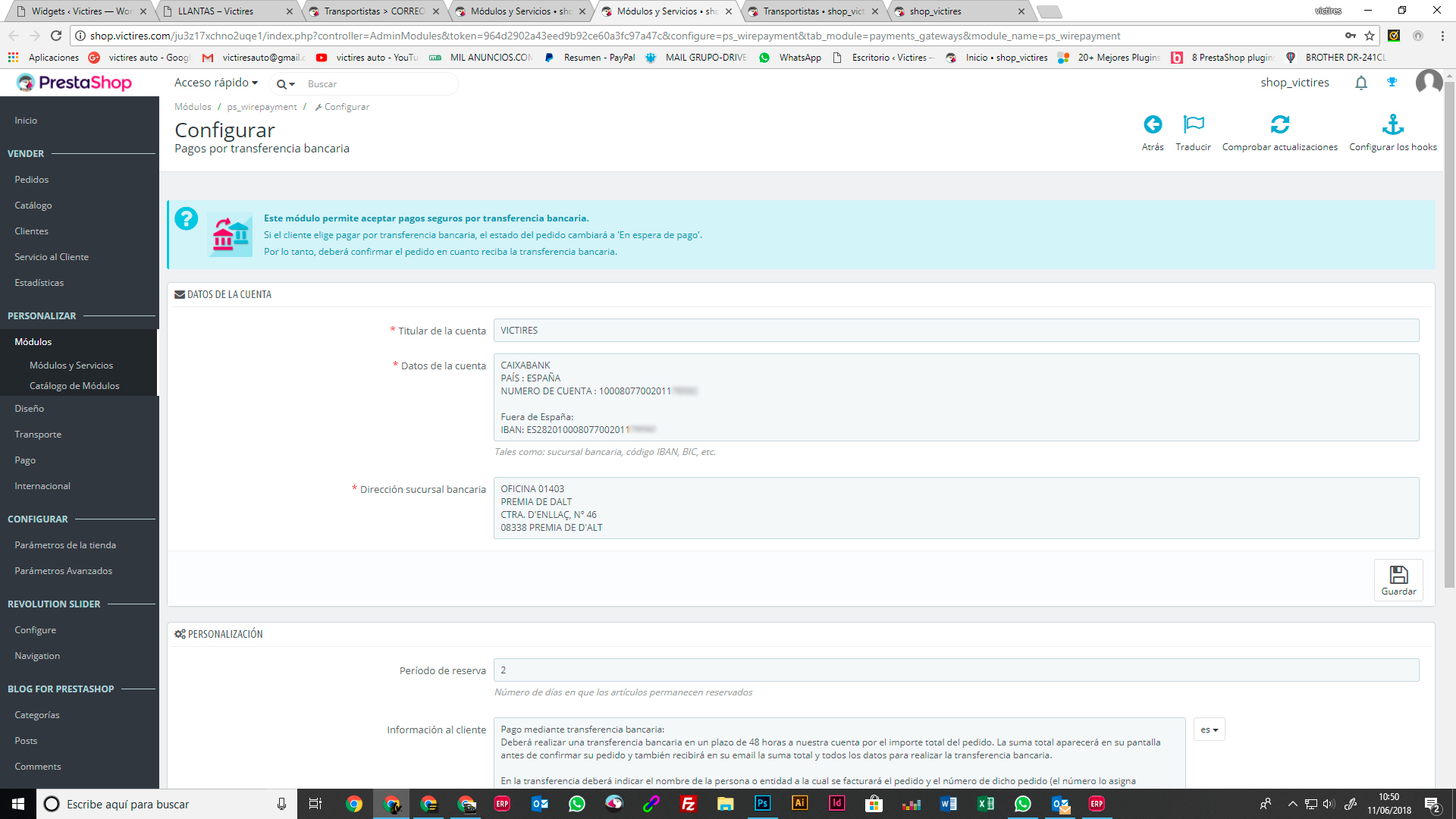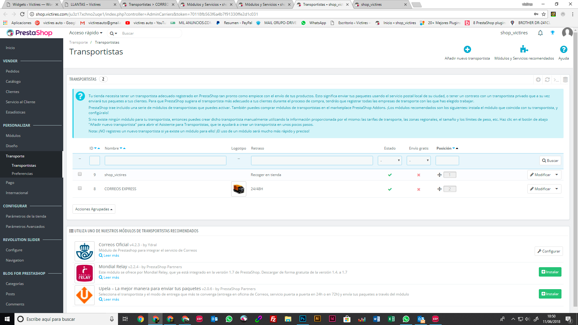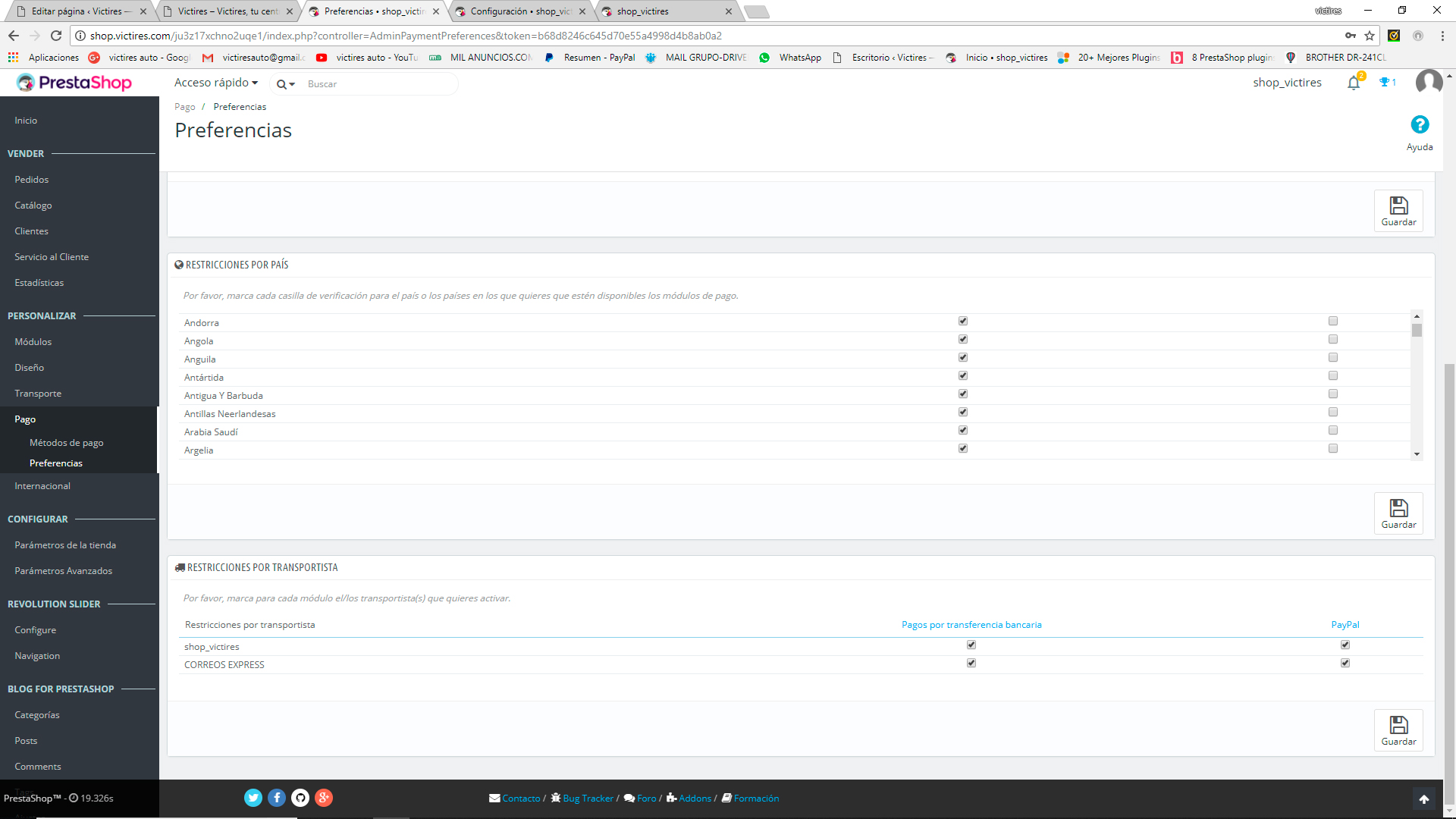 [email protected] Posted June 12, 2018 Author Share Posted June 12, 2018 hace 22 horas, aixos dijo: Hola de nuevo, En Clientes/Direcciones, Establecer los campos requeridos para esta sección, lo despliegas. Y si no lo es, entonces prueba a ver si es esto: desmarca todas las casillas de restricciones por pais, dejalo en blanco y solo deja marcado España, a lo mejor viene por ahí , puede ser que este mal asociado alguno y te afecte a todo el portal Saludos hace 23 horas, aixos dijo: En prestashop 1.7.3.3 la dirección complementaria es opcional, mira este campo porque lo he probado en una instalación limpia y sale el transportista. En "Producto" revisa las medidas peso etc. porque esto tambien afecta para que salga el tranporte o metodo de envío. En "Transportista" revisa bien las 4 fichas del transporte , 1-Configuración 2-Localización 3-Tamaño,peso etc.. 4-Resumen el precio segun destino etc... Todo esto ha de estar bien definido para que funcione correctamente. Saludos .- He activado el modo debug, que me comentabais al principio. .- Ya he quitado en las direcciones a opcional lo que no sea imprescindible, como por ejemplo el campo de empresa, CIF, y dirección 2. .- He desmarcado en las opciones de pago todas las restricciones de todos los países, y he dejado solo ESPAÑA, tanto en PAYPAL, como en TRANSFERENCIA BANCARIA .- He eliminado los transportes y he realizado uno de nuevo, solo por precio total, sin pesos ni medidas, para que no haya confusiones. Seguimos igual.... Con la plantilla de origen, me sigue saliendo que la dirección esta incompleta, aun cuando está todo relleno. y de ahi no pasa. Link to comment Share on other sites More sharing options...