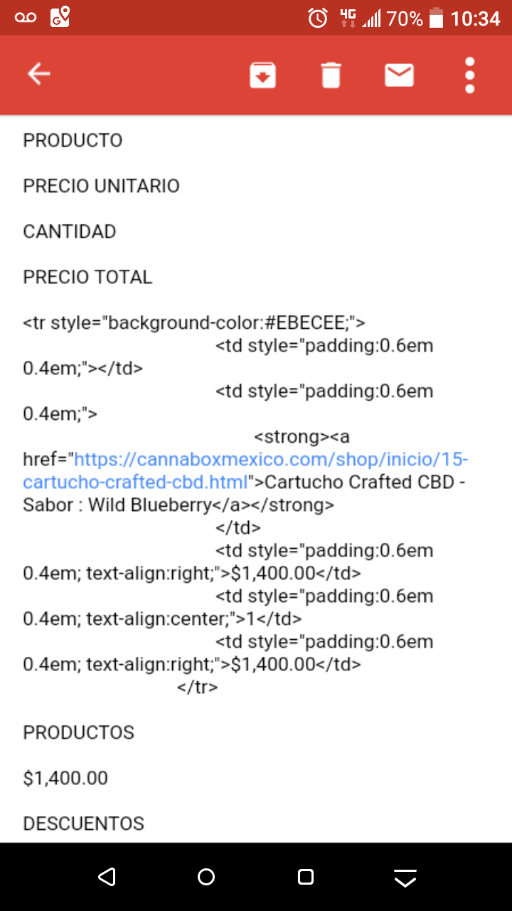 El plan de Dan Posted June 12, 2018 Share Posted June 12, 2018 Muy buenas, compañerxs! Hace poquito actualizamos cannaboxmexico.com a la última versión (1.7.3.3), y desde entonces recibimos todos los emails o en blanco (así me llegan a mí que uso Thunderbird) o en código HTML puro y duro, sin formatear (así le llegan al administrador de la tienda y a todos los clientes). ¿Sabéis a qué puede deberse y cómo corregirlo? He mirado en el directorio /mails pero todo parece estar OK, sólo se me ocurre que tenga que ver con la forma de gestionar el servidor los emails (como las funciones de PHP que se usan o algo así, pero ahí me pierdo, no soy técnico). Os dejo adjunto un pantallazo de cómo se ve. Gracias por vuestra ayuda! Link to comment Share on other sites More sharing options...
