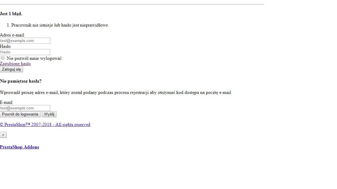 Spróbowałem więc powrócić do najwcześniejszej zapisanej wersji Prestashop, w u mnie w 1-clik upgrade była to wersja 1.6.0.x. Po powróceniu do poprzedniej wersji, nie mogę się zalogować, nie widać strony, strona logowania też jest mocno ograniczona, wyświetla wersję tekstową - tak jak na załączonym zdjęciu.