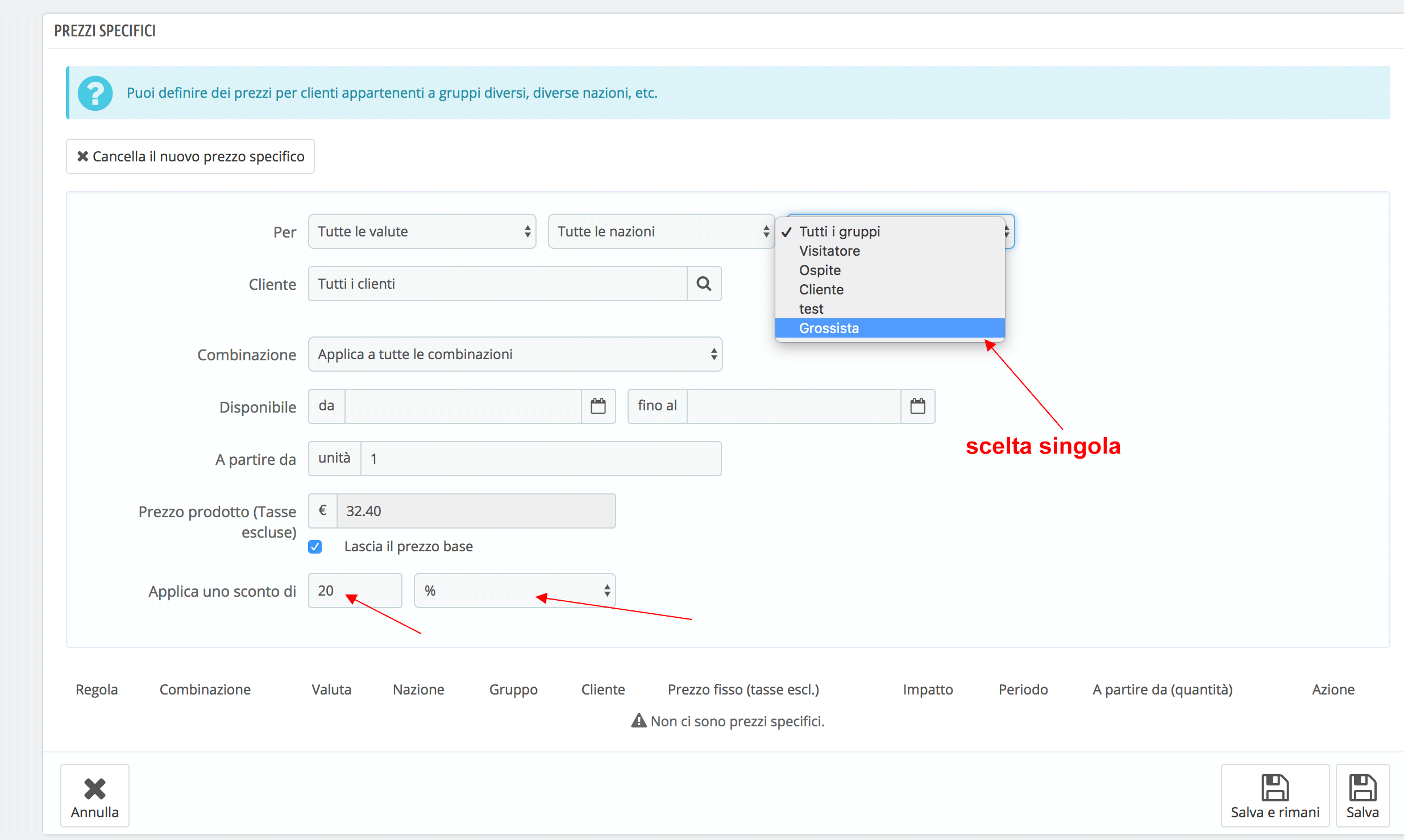 ballashop Posted June 19, 2018 Share Posted June 19, 2018 Ciao, mi si è posta l'esigenza di creare listini diversi. Uso PS 1.6.1.18, disabilitato B2B, non uso la gestione magazzino avanzata, i prezzi sono iva esclusa. Ho creato il gruppo Grossista: Clienti --> Gruppi --> nuovo --> Grossista --> 20% --> tasse escluse --> mostra prezzi: SI --> tutti i moduli autorizzati Avendo già un nutrito catalogo con molte categorie, ho cominciato ad abilitare le suddette alla vista del gruppo Grossista (altrimenti non visibili perché il gruppo è nato dopo le categorie) non so se esiste un comando che faciliti questa procedura. Durante questa fase ho riscontrato subito un problema: Gli sconti applicati su determinati prodotti tramite l'opzione "prezzi specifici". La tab "prezzi specifici", all'interno della scheda prodotto, oltre al problema che non è possibile modificare uno sconto già applicato, ma solamente cestinarlo, non permette selezioni multiple dei gruppi, nell'applicare lo sconto. L'immagine sotto vale più di mille parole... Ho dedotto che, per applicare lo sconto del 20% al gruppo Grossista, basta selezionare il medesimo dalla tendina, ma se volessi applicare un'altro sconto, questa volta ai restanti gruppi, sono obbligato a creare n sconti per n gruppi rimasti. Quindi, se volessi applicare uno sconto del 10% ai gruppi Visitatore, Ospite e Cliente, devo creare 3 prezzi specifici identici al 10%. Non c'è altra soluzione? Spero in un vostro aiuto. Ciao. Link to comment Share on other sites More sharing options...