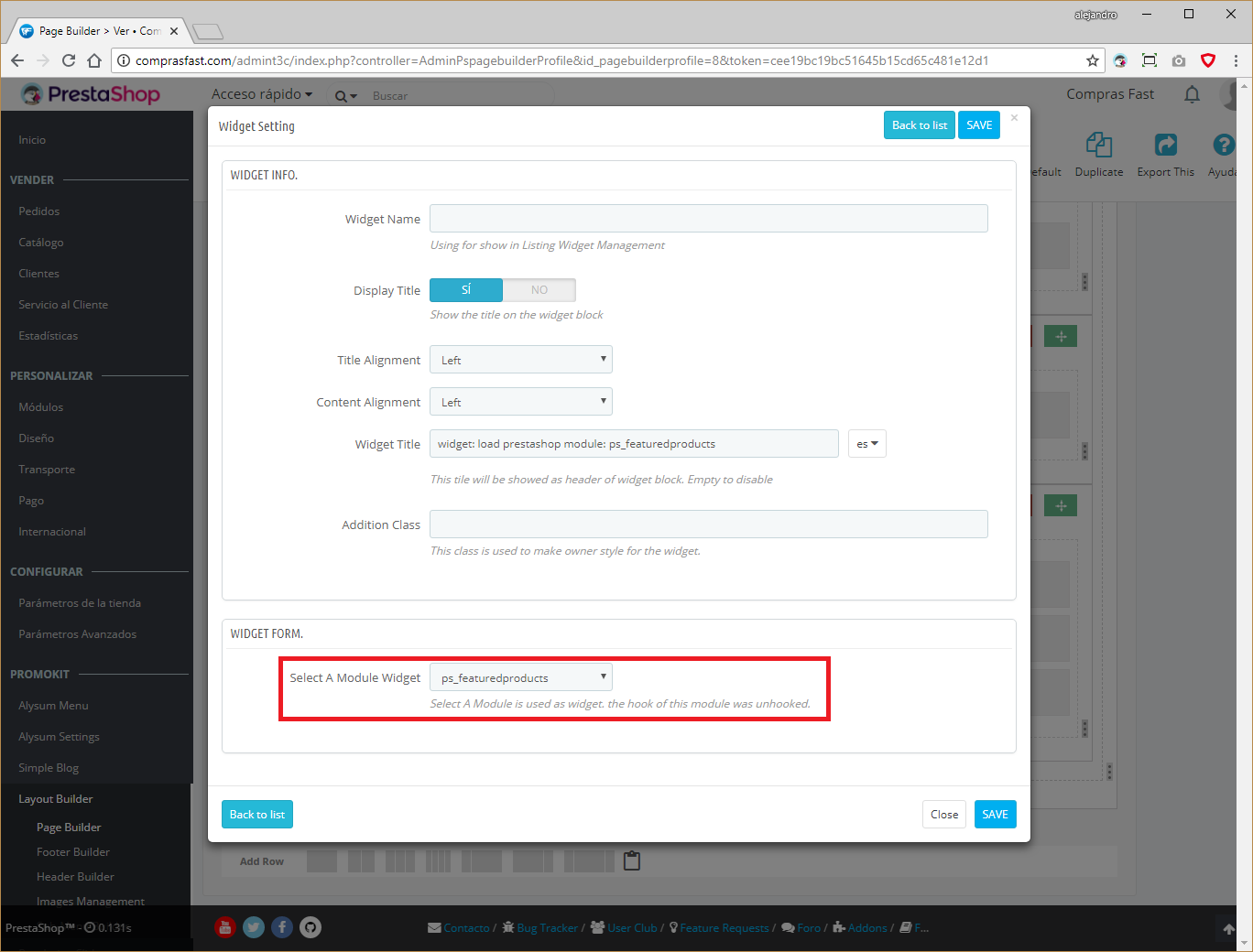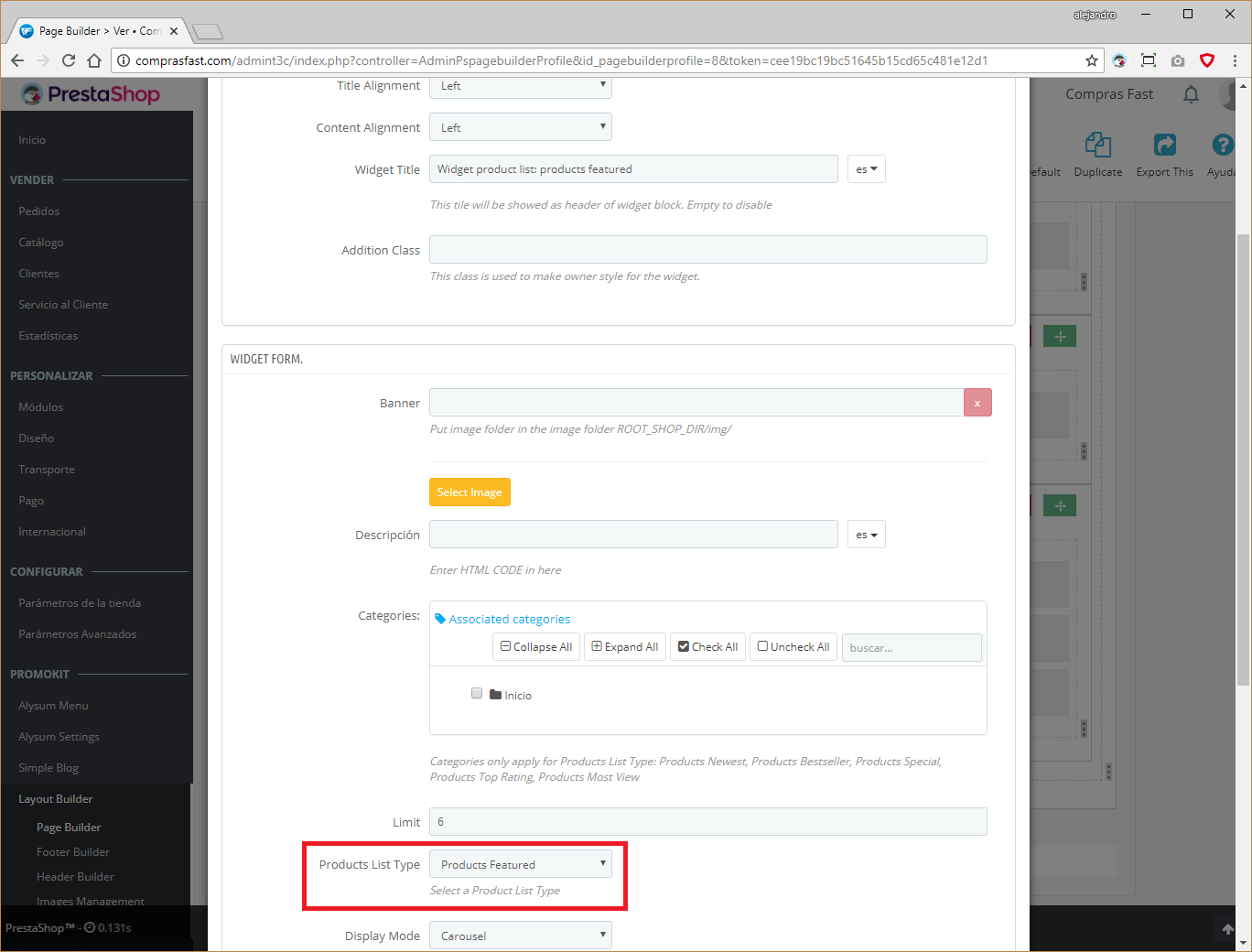 un tercer ejemplo o incógnita es que en el builder en tercer lugar debajo de "product tabs" y "product list" tengo el widget "load prestashop module", donde tengo seleccionado el módulo "ps_featuredproducts" y en este salen los 8 productos que tengo anclados a la categoría "inicio" que según entiendo es mediante la cual deberían aparecer los productos destacados