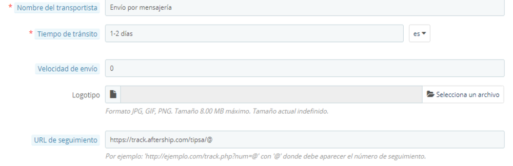 En transporte > transportistas lo tengo configurado de la siguiente manera: