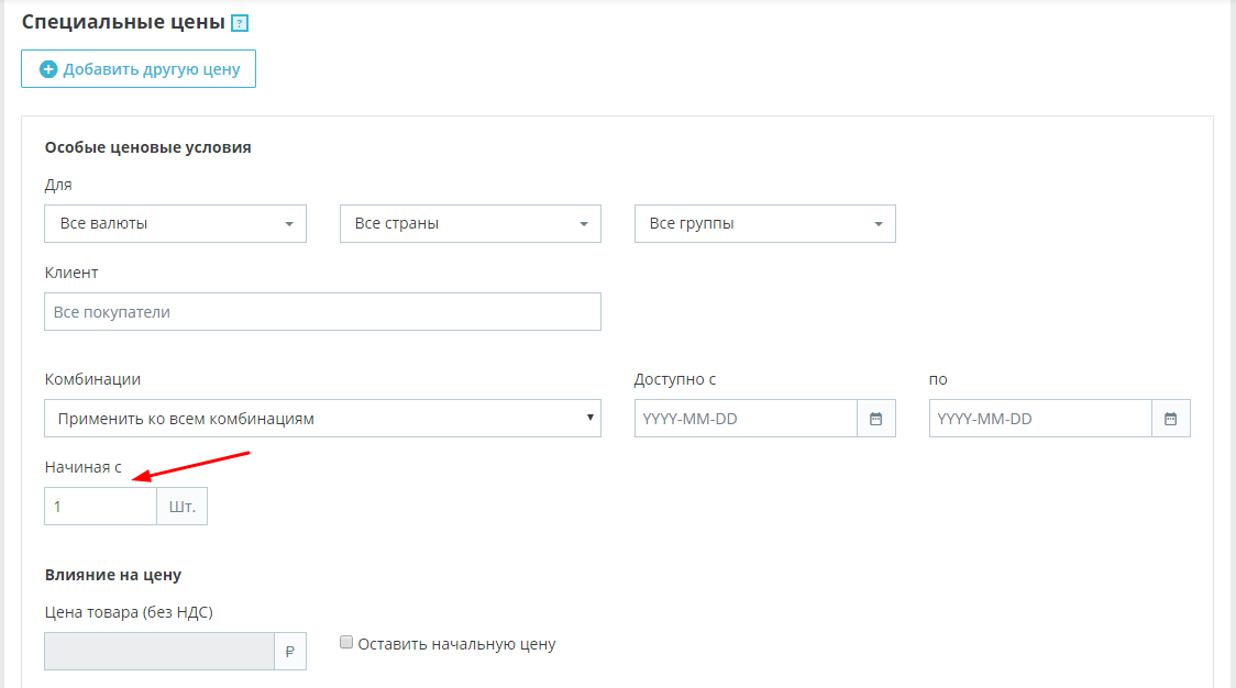 При добавлении товара есть возможность добавить к нему специальную цену, но применить её можно в зависимости от количества товара (см. скриншот), а мне нужно применить ее в зависимости от ОБЩЕЙ ИТОГОВОЙ стоимости корзины.