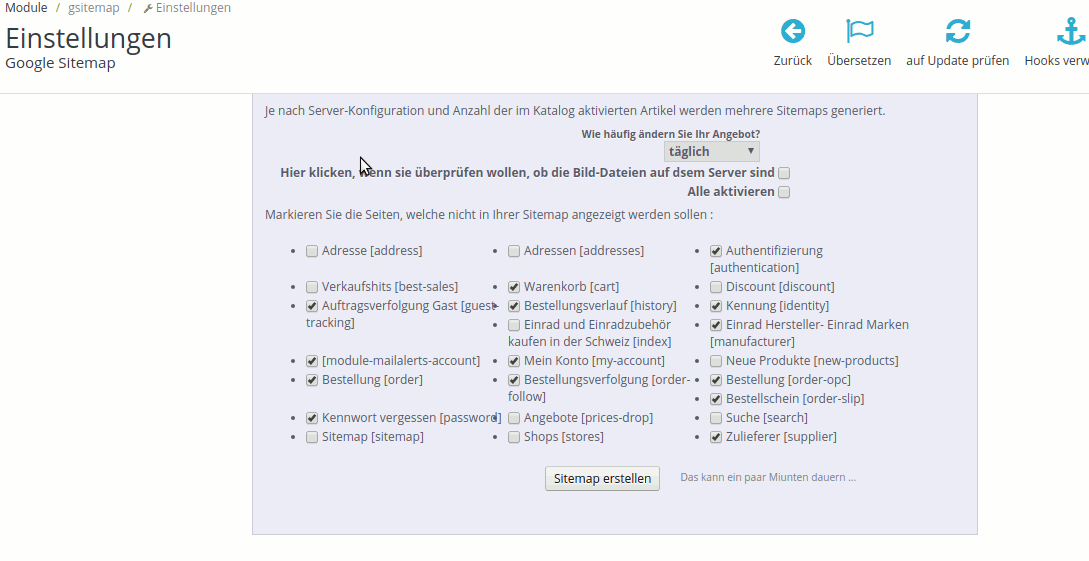 unikum Posted July 6, 2018 Share Posted July 6, 2018 Guten Tag Das bei Prestashop 1.6 integrierte Google Sitemap Modul bietet verschiedene Einstellmöglichkeiten. Ich möchte natürlich, dass die Produkte in meinem Shop möglichst gut indexiert werden und kein Müll. Ich weiss daher nicht genau was ich aktivieren resp deaktivieren soll. Zb. gibt es gleich zweifach den Menupunkt "Adressen", womit ich nichts anfangen kann. Welche Punkte würdet ihr mittels häkchen deaktivieren ? Viele Grüsse Stefan Link to comment Share on other sites More sharing options...