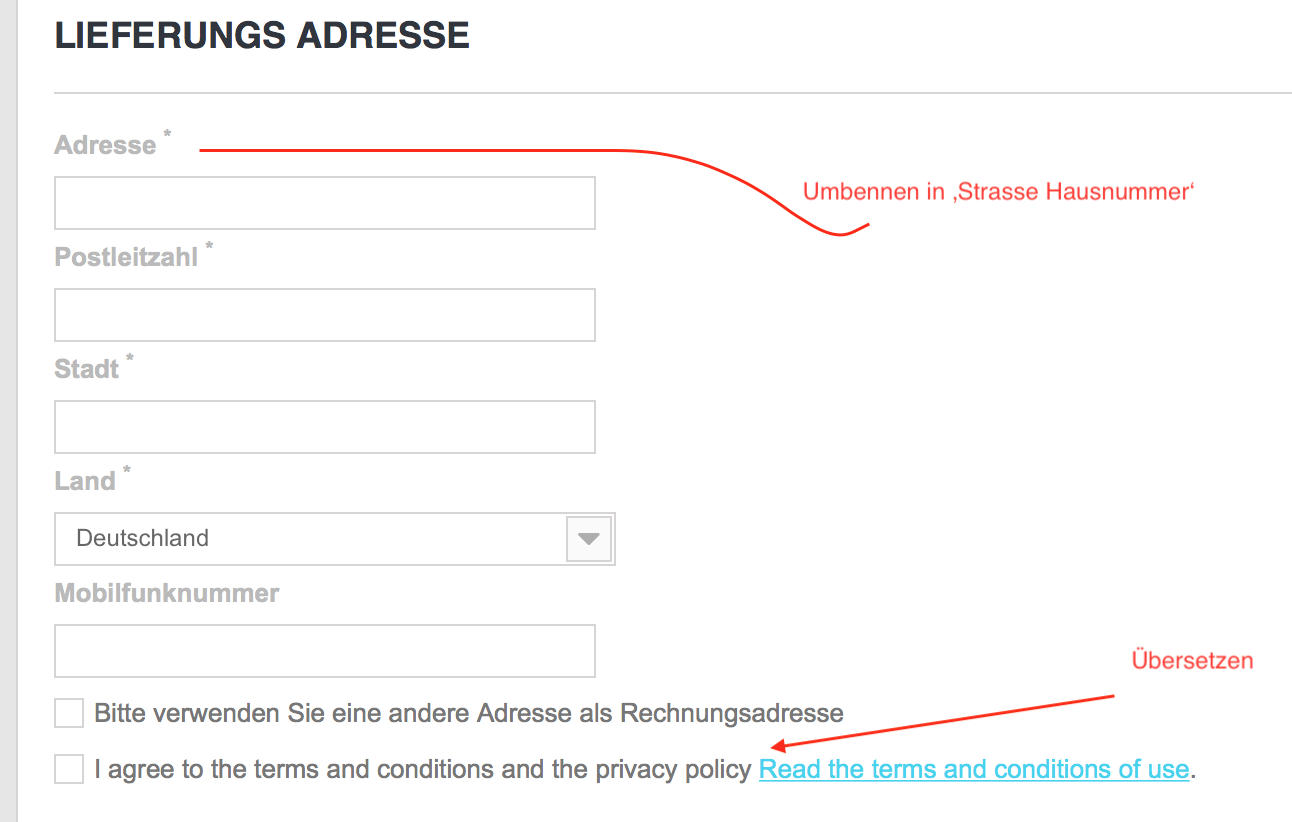 Arnout Posted July 8, 2018 Share Posted July 8, 2018 Hallo ich möchte gerne den Tekst 'Adresse' umbenennen in 'Strasse und Hausnummer' oder so dass eine Strasse und Hausnummer eingegeben werden muss. Vielen Kunden vergessen die Hausnummer einzugeben .. Und ich kann nirgendwo die Übersetzung von Terms and Conditions finden (bei Gastbestellung) .. Bei Accountbestellung ist alles ok. Danke! Presta 1.6.1 Link to comment Share on other sites More sharing options...