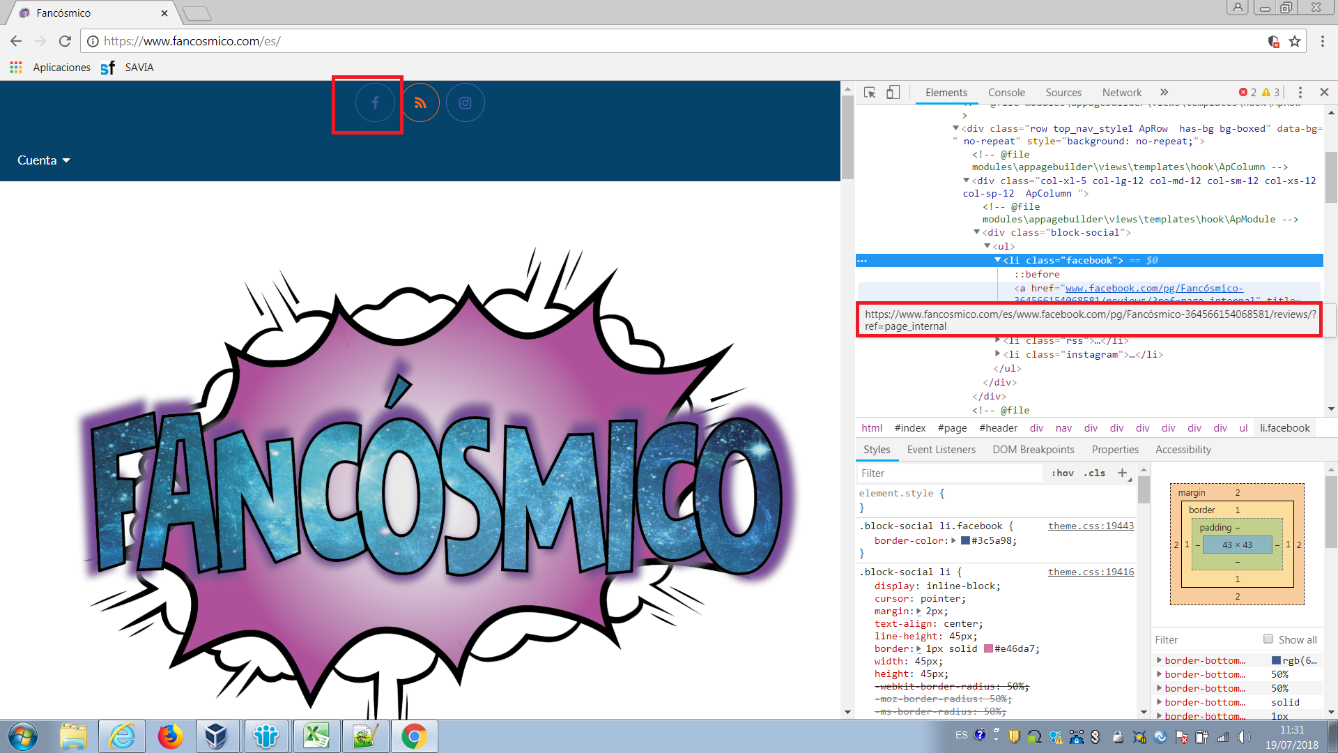 Sara González Posted July 19, 2018 Share Posted July 19, 2018 Hola!! Necesito ayuda...! Utilizo Prestashop 1.7 y mi url es https://www.fancosmico.com/es/. Tengo un problema con los enlaces de seguimiento de RRSS. He posicionado el modulo en el Navy1. Al configurarlo aparecen los iconos correspondientes, pero, al poner el cursor encima aparece la manita pero al clickar no hace nada, no se abre el enlace. Al inspeccionar el elemento veo que el enlace aparentemente es correcto, pero al poner el cursor encima veo que el enlace de conexión aparece concatenado con la url actual y al clickar evidentemente me da el error 404... He probado a reiniciar el modulo y a volver a ponerlo en el footer, pero nada no me funciona. Adjunto print. ¿Me puede ayudar alguien pleaseeee? Gracias!! Link to comment Share on other sites More sharing options...