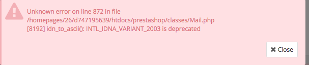 ksaan Posted January 21, 2019 Share Posted January 21, 2019 There is maybe 2 issues: - Unknown error on line 872 in file /homepages/26/d747195639/htdocs/prestashop/classes/Mail.php [8192] idn_to_ascii(): INTL_IDNA_VARIANT_2003 is deprecated and - Uncaught PHP Exception Symfony\Component\Debug\Exception\UndefinedFunctionException: "Attempted to call function "idn_to_ascii" from the global namespace." at /var/www/html/classes/Mail.php line 881. These are 2 different error messages although both linked to mail. So 2 issues => 2 different solutions Link to comment Share on other sites More sharing options...