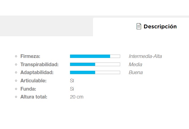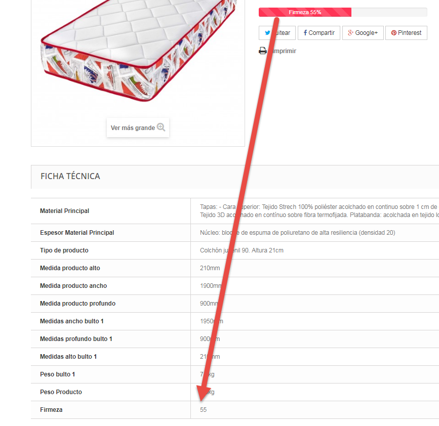 albertosunlife Posted August 4, 2018 Share Posted August 4, 2018 Hola! Lo que estoy buscando me tiene bastante desesperado, ya que no encuentro ningún módulo ni la forma de hacerlo, y toda mi competencia lo tiene (algunos usan wordpress u otros sistemas de tienda online, pero no prestashop). Tengo una web de colchones, y me gustaría añadir a cada producto una barra de progreso en la que el cliente pueda ver fácilmente el nivel de dureza de los colchones, como en el ejemplo que pongo más abajo. Yo con poner solo la barra de *firmeza ya me daría con un canto en los dientes. ¿Existe alguna forma de hacerlo? Mil gracias por adelantado Link to comment Share on other sites More sharing options...