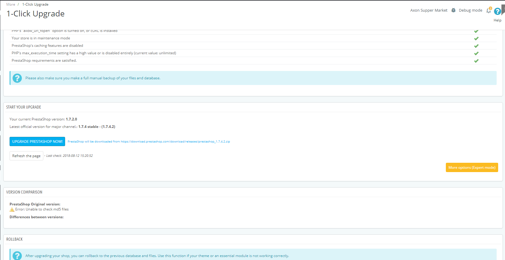 Dennis95 Posted August 12, 2018 Share Posted August 12, 2018 Hello, im trying to use this pluginj to update my prestashop site to last version on 1.7.4.2 from 1.7.2 cause i'm experiencing visual errors. When i click the upgrade button nothing is in progress, i only see this error: PrestaShop Original version: Error: Unable to check md5 files Differences between versions: Can you help me? I attach all screens Best regards Link to comment Share on other sites More sharing options...