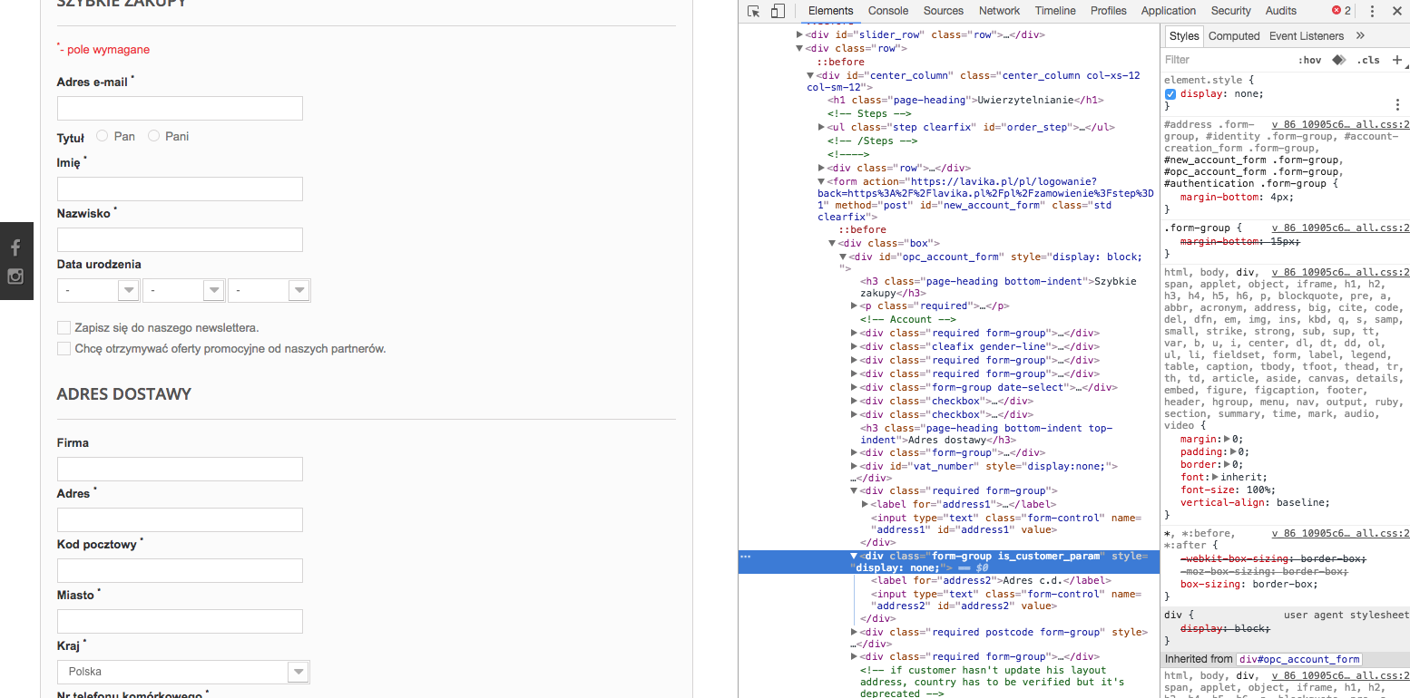 hubi10 Posted August 13, 2018 Share Posted August 13, 2018 Witam, mam taką dziwną sytuację: W preście jest prawidłowo ustawione że ma wyświetlać dwie linie adresu, ale na stronie druga nie jest widoczna. Przejrzałem nieco css wyświetlanej strony i okazuje się że mam ustawione: element.style { display: none; } W którym pliku/gdzie mogę zmienić żeby wyświetlać to normalnie? Link to comment Share on other sites More sharing options...