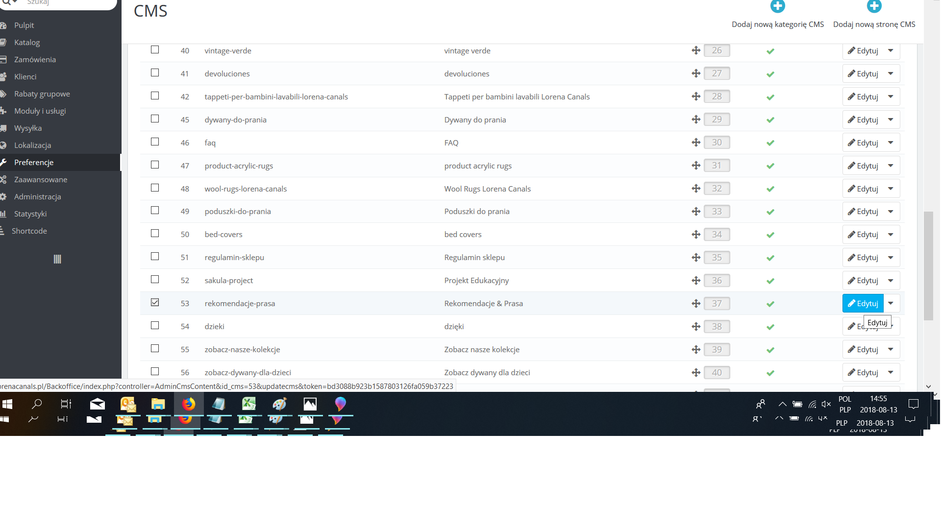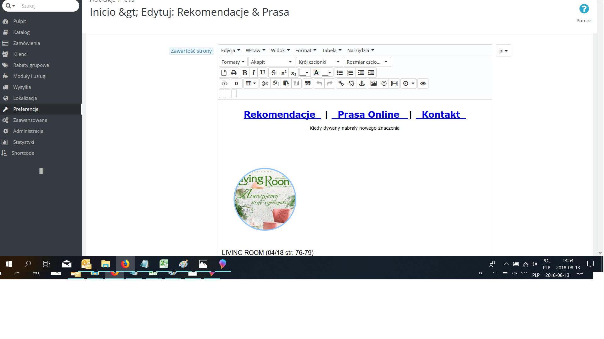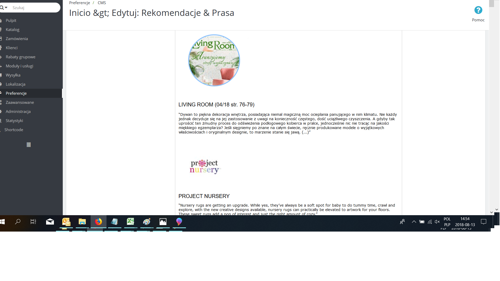 Wchodzę więc w zakładkę "Preferencje"->"CMS" , a następnie w daną stronę "Rekomendacje&Prasa".