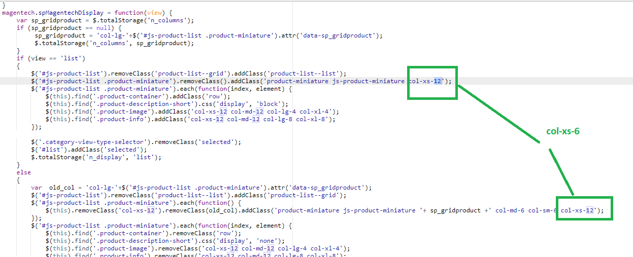 You also need to make similar changes i.e. xs-12 to xs-6 in JS file. As JS files are combined so I am not able to let you the exact JS in which you need to make changes but sharing the reference according to the default theme i.e. themes/default-bootstrap/js/global.js (JS function display)