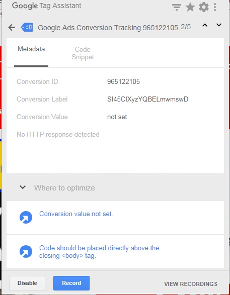 mundohuella Posted August 16, 2018 Share Posted August 16, 2018 hace 9 minutos, gusman126 dijo: antes como lo tenias? con codigo o un modulo? has comprobado si hay una version nueva del modulo? busca el codigo que ya estaba puesto en los ficheros tpl, cambia solo lo necesario puedes usar el tagmanager, para añadir el codigo de adwords , hay varios tutoriales en youtube El código de antes me estaba funcionando bien, pero con la actualización de Google Adwords a Google Ads el 24 de Julio me dejo de funcionar. Y el código es totalmente diferente y los tutoriales que hay son lo mismo que como lo tenía anteriormente y no veo ningún hilo, ni ningún video que hable de este tema, no se si solo me ha pasado a mi por algún motivo que desconozco. El Tag Manager Assistant me dice: No HTTP resonse detected Conversion value not set La verdad es que estoy un poco perdido, poruqe no hay información al respecto. Muchas gracias por responder. Un saludo. Link to comment Share on other sites More sharing options...