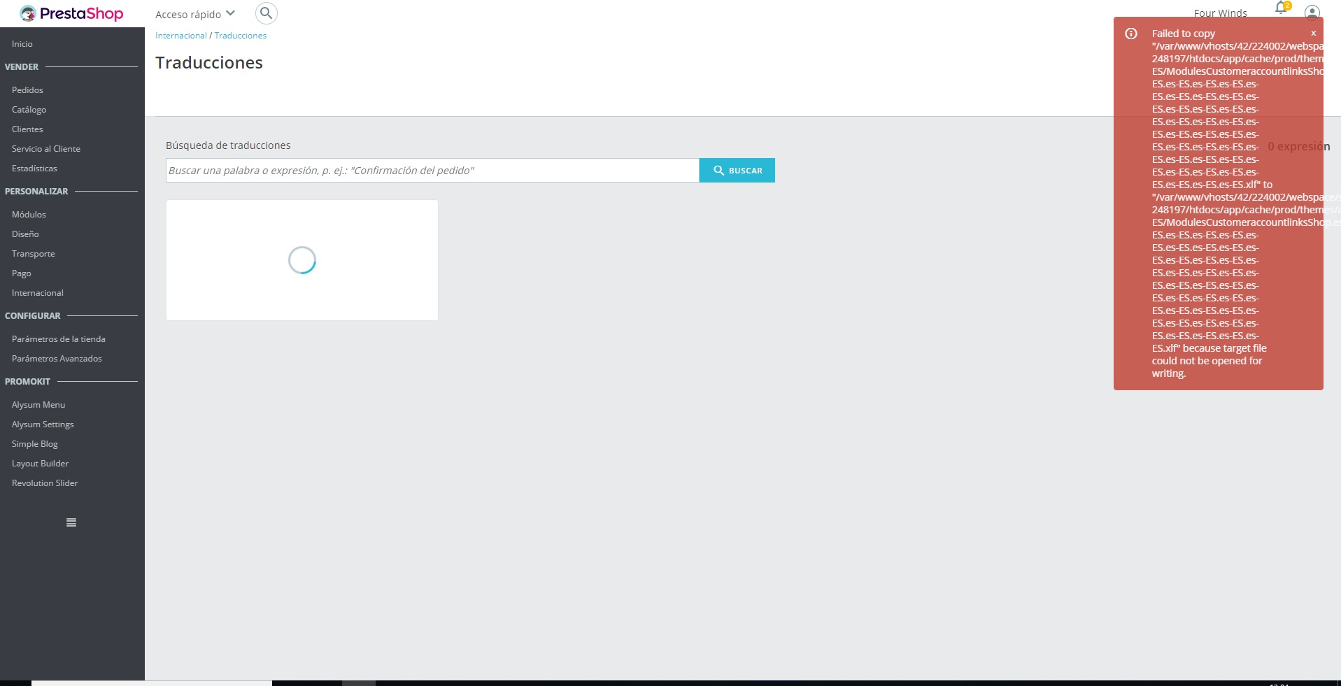 Sergio.R Posted August 18, 2018 Share Posted August 18, 2018 Buenos días a todos, recientemente he comprado un tema de pago, con bastantes valoraciones, todo positivo en general, hasta el momento no he tenido ningún problema con el, salvo varias traducciones que quiero cambiar, cuando intento entrar al modulo de traducciones de PS, tengo que elegir exactamente que traducciones quiero cambiar, y cuando elijo traducciones de tema me lanza un error al cargar ciertos archivos debido a que los permisos del archivo no permite cargarlos. Ya he contactado con el servicio técnico del tema, me dice que el problema parte de los permisos que debo ponerlos en 777 para toda la carpeta cache(es el directorio de los archivos que dan el error). Me recomiendan contactar con mi hosting, y así lo hice, modifiqué los permisos, pero claro, es la carpeta cache, con lo cual se actualizan constantemente con cada cambio que haga en el backoffice, y por tanto vuelve a generar los archivos de dicha carpeta, y los permisos se vuelven de nuevo a 666, entonces continua el error, tras informame, veo que es algo común, y me recomienda que pregunta por aquí. Alguien sabría decirme como puedo cambiar las traducciones si los archivos que intenta tocar se cambian los permisos automaticamente? Para documentar un poco el tema adjunto las capturas de los pasos a seguir y del error en concreto. Como podéis ver en la tercera imagen, ese archivo es el que me devuelve el error, si cambio los permisos a 777, vuelven a 666 en cuanto hago click sobre las traducciones. Alguna idea o solución? Un saludo Link to comment Share on other sites More sharing options...